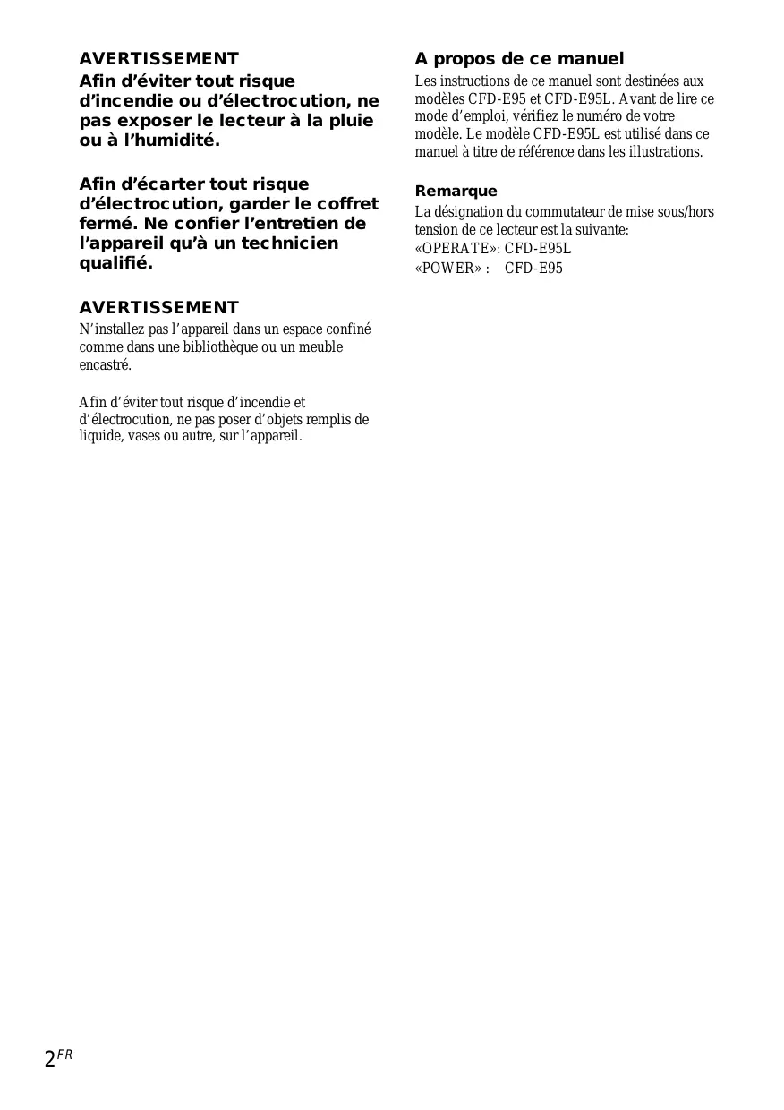 - «POWER» : CFD-E95 AVERTISSEMENT N’installez pas l’appareil dans un espace confiné comme dans une bibliothèque ou un meuble encastré. Afin d’éviter tout risque d’incendie et d’électrocution, ne pas poser d’objets remplis de liquide, vases ou autre, sur l’appareil. 2FR Les instructions de ce manuel sont destinées aux modèles CFD-E95 et CFD-E95L. Avant de lire ce mode d’emploi, vérifiez le numéro de votre modèle. Le modèle CFD-E95L est utilisé dans ce manuel à titre de référence dans les illustrations. Table des matières Opérations de base Opérations de base Lecture d’un CD p. 4