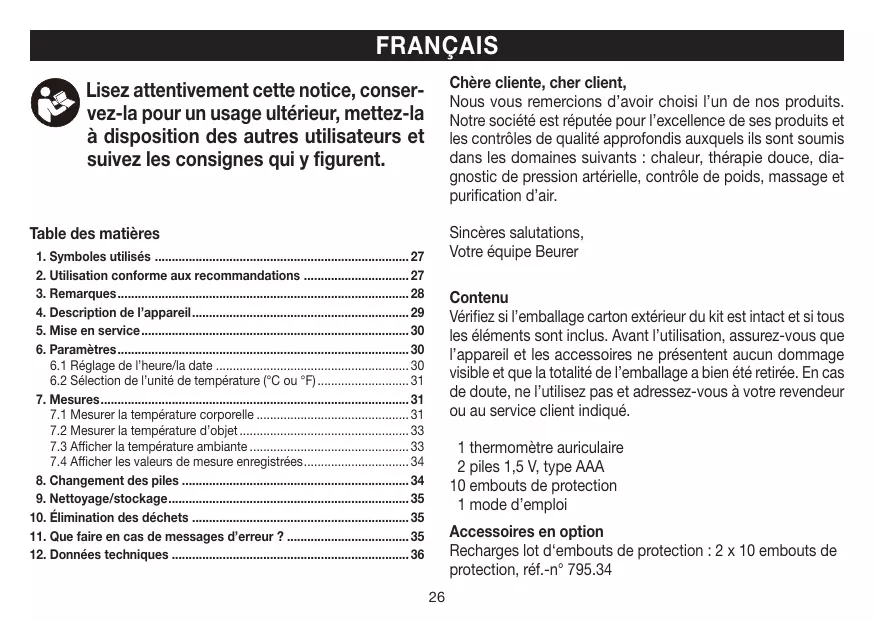 1 thermomètre auriculaire 2 piles 1,5 V, type AAA 10 embouts de protection 1 mode d'emploi