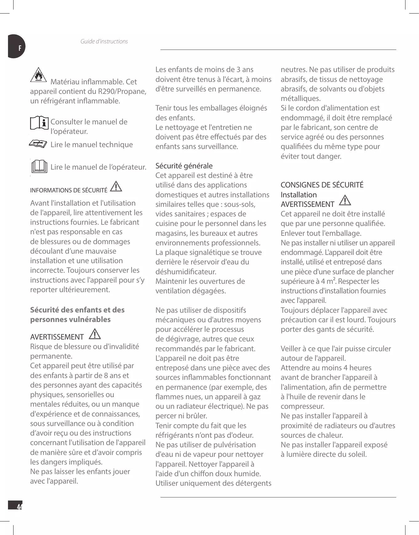 Fabrikanten er ikke ansvarlig dersom feilaktig installering og bruk forårsaker skade på personer eller eiendom. Oppbevar alltid bruksanvisningen sammen med enheten til fremtidig bruk. Sikkerheten til barn og sårbare mennesker Avant l'installation et l'utilisation de l'appareil, lire attentivement les instructions fournies. Le fabricant n'est pas responsable en cas de blessures ou de dommages découlant d’une mauvaise installation et une utilisation incorrecte. Toujours conserver les instructions avec l'appareil pour s’y reporter ultérieurement. Sécurité des enfants et des personnes vulnérables AVERTISSEMENT Risque de blessure ou d'invalidité permanente. Cet appareil peut être utilisé par des enfants à partir de 8 ans et des personnes ayant des capacités physiques, sensorielles ou mentales réduites, ou un manque d'expérience et de connaissances, sous surveillance ou à condition d’avoir reçu ou des instructions concernant l'utilisation de l'appareil de manière sûre et d’avoir compris les dangers impliqués. Ne pas laisser les enfants jouer avec l'appareil. 44
