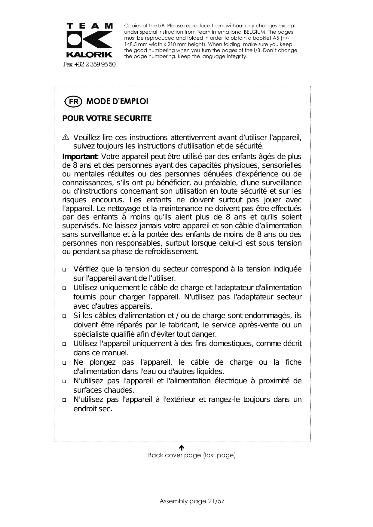 Back cover page (last page) C’est pourquoi dans notre mode d’emploi nous disons toujours au client de débrancher la fiche de la prise de courant dès qu’il a fini d’utiliser le produit. La notice d’utilisation est aussi disponible en format électronique sur simple demande auprès du service après-vente (voir carte de garantie).