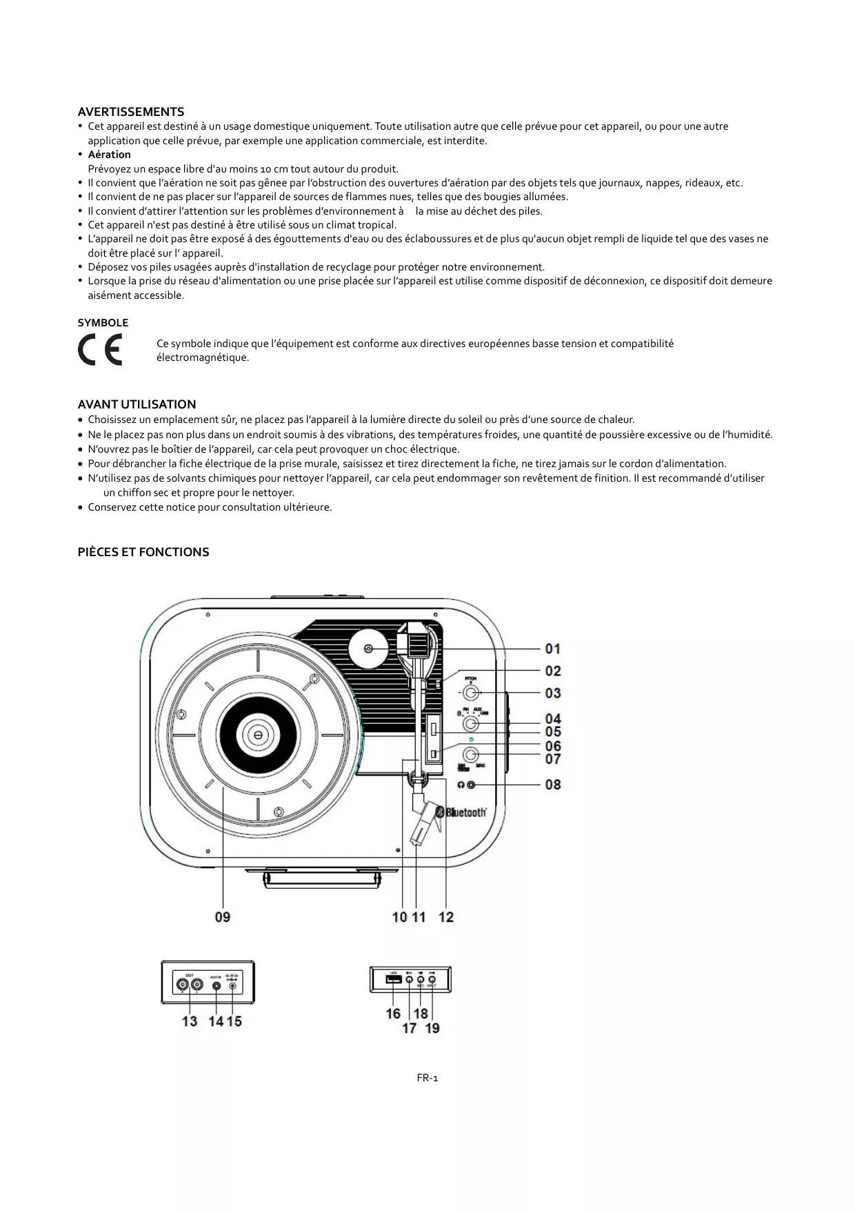 AVERTISSEMENTS Cet appareil est destiné à un usage domestique uniquement. Toute utilisation autre que celle prévue pour cet appareil, ou pour une autre application que celle prévue, par exemple une application commerciale, est interdite. Aération Prévoyez un espace libre d'au moins 10 cm tout autour du produit. Il convient que l’aération ne soit pas gênee par l’obstruction des ouvertures d’aération par des objets tels que journaux, nappes, rideaux, etc. Il convient de ne pas placer sur l’appareil de sources de flammes nues, telles que des bougies allumées. Il convient d’attirer l’attention sur les problèmes d’environnement à la mise au déchet des piles. Cet appareil n'est pas destiné à être utilisé sous un climat tropical. L’appareil ne doit pas être exposé á des égouttements d'eau ou des éclaboussures et de plus qu'aucun objet rempli de liquide tel que des vases ne doit être placé sur l’ appareil. Déposez vos piles usagées auprès d'installation de recyclage pour protéger notre environnement. Lorsque la prise du réseau d'alimentation ou une prise placée sur l’appareil est utilise comme dispositif de déconnexion, ce dispositif doit demeure aisément accessible. SYMBOLE Ce symbole indique que l’équipement est conforme aux directives européennes basse tension et compatibilité électromagnétique. AVANT UTILISATION Choisissez un emplacement sûr, ne placez pas l’appareil à la lumière directe du soleil ou près d’une source de chaleur. Ne le placez pas non plus dans un endroit soumis à des vibrations, des températures froides, une quantité de poussière excessive ou de l’humidité. N’ouvrez pas le boîtier de l’appareil, car cela peut provoquer un choc électrique. Pour débrancher la fiche électrique de la prise murale, saisissez et tirez directement la fiche, ne tirez jamais sur le cordon d’alimentation. N’utilisez pas de solvants chimiques pour nettoyer l’appareil, car cela peut endommager son revêtement de finition. Il est recommandé d’utiliser un chiffon sec et propre pour le nettoyer. Conservez cette notice pour consultation ultérieure.
