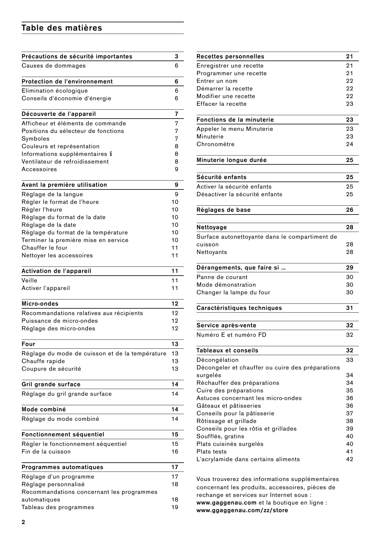 : Vous trouverez des informations supplémentaires concernant les produits, accessoires, pièces de rechange et services sur Internet sous : www.gaggenau.com et la boutique en ligne : www.ggaggenau.com/zz/store m Précautions de sécurité importantes Lire attentivement ce manuel. Ce n'est qu'alors que vous pourrez utiliser votre appareil correctement et en toute sécurité. Conserver la notice d'utilisation et de montage pour un usage ultérieur ou pour le propriétaire suivant. Cet appareil est conçu pour être encastré uniquement. Respecter la notice spéciale de montage. Contrôler l'état de l'appareil après l'avoir déballé. Ne pas le raccorder s'il présente des avaries de transport. Seul un expert agréé peut raccorder l'appareil sans fiche. La garantie ne couvre pas les dommages résultant d'un mauvais raccordement. Cet appareil est conçu uniquement pour un usage ménager privé et un environnement domestique. Utiliser l'appareil uniquement pour préparer des aliments et des boissons. Surveiller l'appareil lorsqu'il fonctionne. Utiliser l'appareil uniquement dans des pièces fermées. Cet appareil est conçu pour une utilisation jusqu'à une altitude maximale de 4 000 m. Cet appareil peut être utilisé par des enfants de 8 ans ou plus et par des personnes dotées de capacités physiques, sensorielles ou mentales réduites ou disposant de connaissances ou d’expérience insuffisantes, sous la surveillance d'un tiers responsable de leur sécurité ou bien lorsqu'ils ont reçu des instructions liées à l'utilisation de l'appareil en toute sécurité et qu'ils ont intégré les risques qui en résultent. Les enfants ne doivent pas jouer avec l'appareil. Le nettoyage et l'entretien effectué par l'utilisateur ne doivent pas être accomplis par des enfants, sauf s'ils sont âgés de 8 ans et plus et qu'un adulte les surveille. Les enfants de moins de 8 ans doivent être tenus à distance de l'appareil et du cordon d'alimentation. Introduire les accessoires toujours dans le bon sens dans l'enceinte de cuisson. Voir la description des accessoires dans la notice d'utilisation. Risque d'incendie ! Tout objet inflammable entreposé dans le compartiment de cuisson peut s'enflammer. Ne jamais entreposer d'objets inflammables dans le compartiment de cuisson. Ne jamais ouvrir la porte de l'appareil lorsqu'il s'en dégage de la fumée. Éteindre l'appareil et débrancher la fiche secteur ou enlever le fusible dans le boîtier à fusibles. ▯ Toute utilisation non conventionnelle de l'appareil est dangereuse et peut provoquer des dommages. Il est interdit de sécher des aliments ou vêtements, de chauffer des chaussons, coussins de graines ou de céréales, éponges, chiffons humides et similaire. Par exemple des chaussons, coussins de graines ou de céréales chauffés peuvent s'enflammer même après plusieurs heures.Utiliser l'appareil uniquement pour préparer des aliments et des boissons. ▯ Les aliments peuvent s'enflammer. Ne jamais réchauffer les aliments dans des emballages qui conservent la chaleur. Ne jamais réchauffer des aliments dans des récipients en plastique, en papier ou autres matériaux inflammables, sans les surveiller. Ne jamais régler une puissance ou une durée de micro-ondes trop élevée. Suivre les indications de cette notice d'utilisation. Ne jamais déshydrater des aliments aux micro-ondes. Ne jamais décongeler ni réchauffer au micro-ondes à une puissance trop élevée ou trop longtemps des aliments dont la teneur en eau est faible, comme du pain. ▯ L'huile alimentaire peut s'enflammer. Ne jamais chauffer de l'huile alimentaire seule aux micro-ondes.