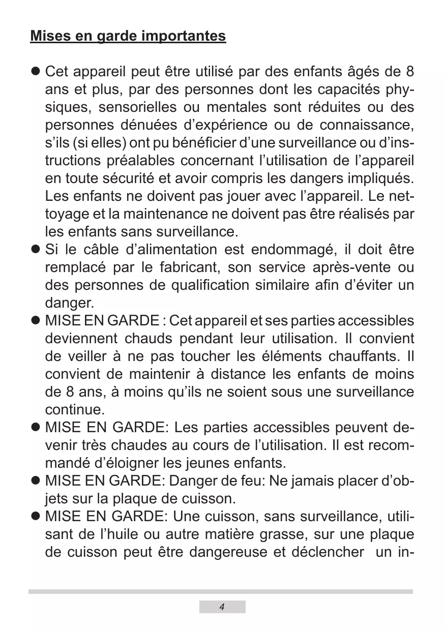 Mises en garde importantes l Cet appareil peut être utilisé par des enfants âgés de 8 ans et plus, par des personnes dont les capacités physiques, sensorielles ou mentales sont réduites ou des personnes dénuées d’expérience ou de connaissance, s’ils (si elles) ont pu bénéficier d’une surveillance ou d’instructions préalables concernant l’utilisation de l’appareil en toute sécurité et avoir compris les dangers impliqués. Les enfants ne doivent pas jouer avec l’appareil. Le nettoyage et la maintenance ne doivent pas être réalisés par les enfants sans surveillance. l Si le câble d’alimentation est endommagé, il doit être remplacé par le fabricant, son service après-vente ou des personnes de qualification similaire afin d’éviter un danger. l MISE EN GARDE : Cet appareil et ses parties accessibles deviennent chauds pendant leur utilisation. Il convient de veiller à ne pas toucher les éléments chauffants. Il convient de maintenir à distance les enfants de moins de 8 ans, à moins qu’ils ne soient sous une surveillance continue. l MISE EN GARDE: Les parties accessibles peuvent devenir très chaudes au cours de l’utilisation. Il est recommandé d’éloigner les jeunes enfants. l MISE EN GARDE: Danger de feu: Ne jamais placer d’objets sur la plaque de cuisson. l MISE EN GARDE: Une cuisson, sans surveillance, utilisant de l’huile ou autre matière grasse, sur une plaque de cuisson peut être dangereuse et déclencher un in-