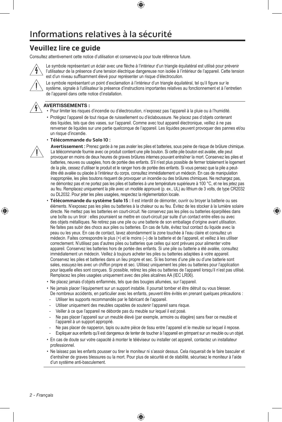 - Télécommande du système Solo 15 : Il est interdit de démonter, ouvrir ou broyer la batterie ou ses éléments. N'exposez pas les piles ou batteries à la chaleur ou au feu. Évitez de les stocker à la lumière solaire directe. Ne mettez pas les batteries en court-circuit. Ne conservez pas les piles ou batteries éparpillées dans une boîte ou un tiroir : elles peuvent se mettre en court-circuit par suite d'un contact entre elles ou avec des objets métalliques. Ne retirez pas une pile ou une batterie de son emballage d'origine avant utilisation. Ne faites pas subir des chocs aux piles ou batteries. En cas de fuite, évitez tout contact du liquide avec la peau ou les yeux. En cas de contact, lavez abondamment la zone touchée à l'eau claire et consultez un médecin. Faites correspondre le plus (+) et le moins (-) de la batterie et de l'appareil, et veillez à les utiliser correctement. N'utilisez pas d'autres piles ou batteries que celles qui sont prévues pour alimenter votre appareil. Conservez les batteries hors de portée des enfants. Si une pile ou batterie a été avalée, consultez immédiatement un médecin. Veillez à toujours acheter les piles ou batteries adaptées à votre appareil. Conservez les piles et batteries dans un lieu propre et sec. Si les bornes d'une pile ou d'une batterie sont sales, essuyez-les avec un chiffon propre et sec. Utilisez uniquement les piles ou batteries pour l'application pour laquelle elles sont conçues. Si possible, retirez les piles ou batteries de l'appareil lorsqu'il n'est pas utilisé. Remplacez les piles usagées uniquement avec des piles alcalines AA (IEC LR06).