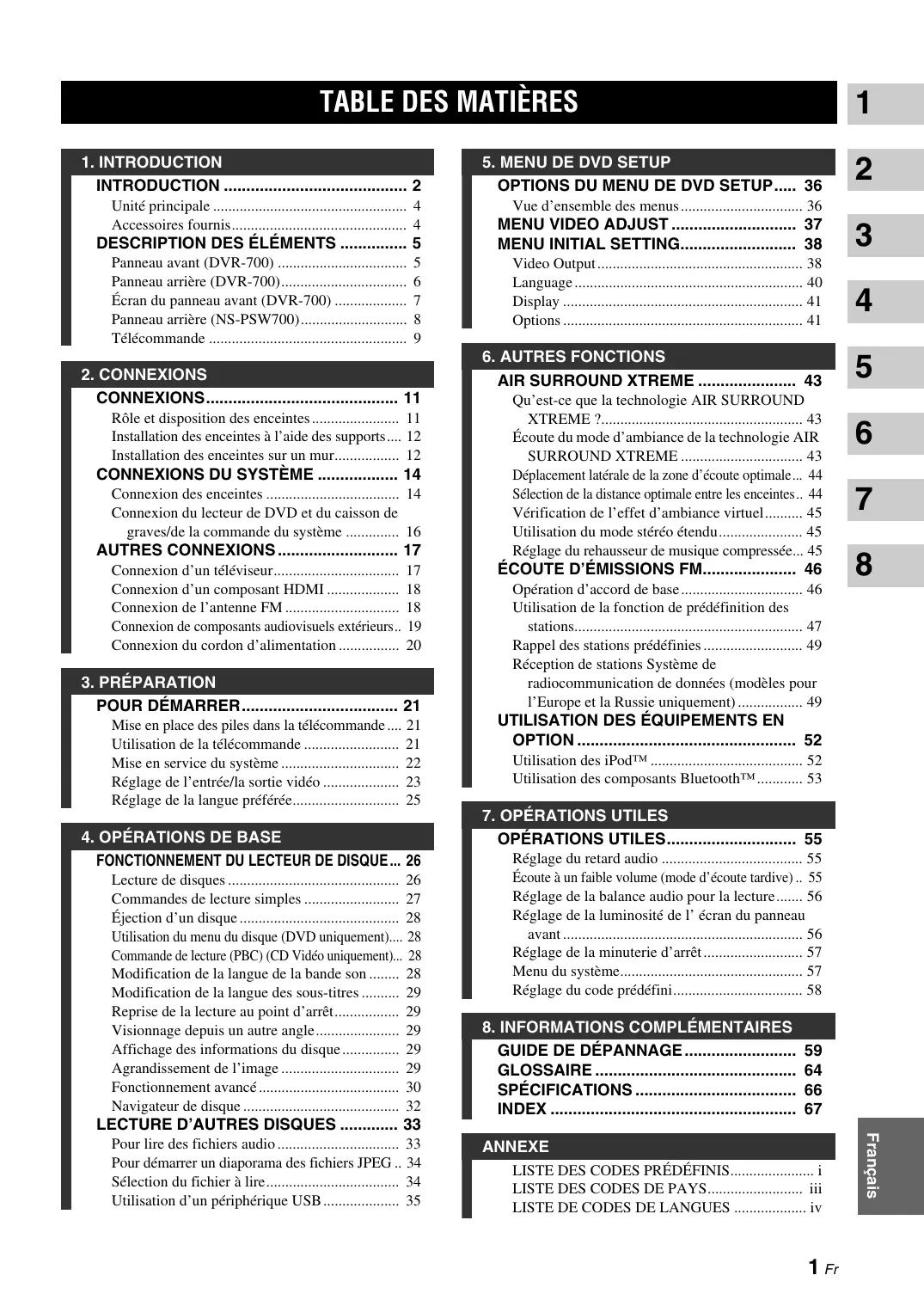 ALL Ce produit intègre une technologie de protection des droits d’auteur protégée par des brevets américains et autres droits de propriété intellectuelle. L’utilisation de cette technologie de protection des droits d’auteur doit être autorisée par Macrovision et doit être limitée à des fins domestiques, ou similaires, sauf accord préalable de Macrovision. L’ingénierie inverse et le désassemblage sont proscrits. INTRODUCTION Entretien du coffret – Utilisez un chiffon doux, légèrement mouillé d’une solution détergente neutre. N’utilisez pas de solution contenant de l’alcool, de l’essence, de l’ammoniaque ou des produits abrasifs. Disques compatibles HDMI, le logo HDMI et High Definition Multimedia Interface sont des marques ou des marques déposées de HDMI Licensing LLC. Ce système utilise de nouvelles technologies et de nouveaux algorithmes qui permettent d’obtenir un son d’ambiance 7 canaux avec seulement deux enceintes, sans l’aide des réflexions murales. Français 3 Fr INTRODUCTION ■ Unité principale Lecteur de DVD (DVR-700) Ensemble des enceintes ■ Accessoires fournis Antenne FM intérieure (modèles pour les États-Unis, le Canada, l’Asie et Taïwan) Télécommande (modèles pour l’Europe, la Russie et l’Australie) DVX-700 WP87020 STANDBY/ON