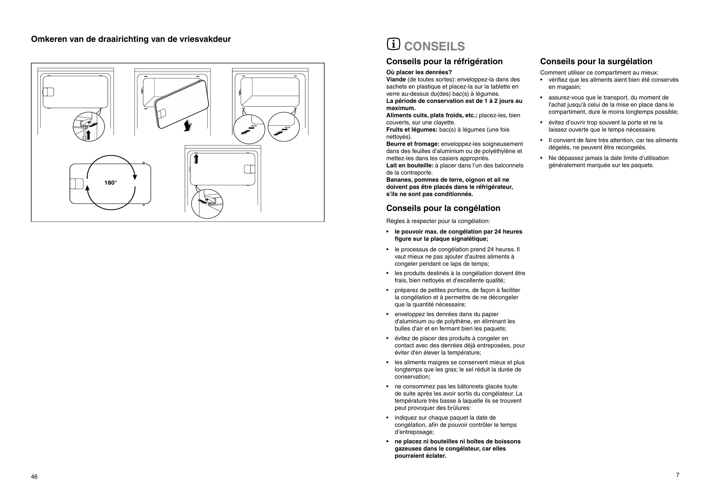 Viande (de toutes sortes): enveloppez-la dans des sachets en plastique et placez-la sur la tablette en verre au-dessus du(des) bac(s) à légumes. La période de conservation est de 1 à 2 jours au maximum. Aliments cuits, plats froids, etc.: placez-les, bien couverts, sur une clayette. Fruits et légumes: bac(s) à légumes (une fois nettoyés). Beurre et fromage: enveloppez-les soigneusement dans des feuilles d’aluminium ou de polyéthylène et mettez-les dans les casiers appropriés. Lait en bouteille: à placer dans l’un des balconnets de la contreporte. Bananes, pommes de terre, oignon et ail ne doivent pas être placés dans le réfrigérateur, s’ils ne sont pas conditionnés.