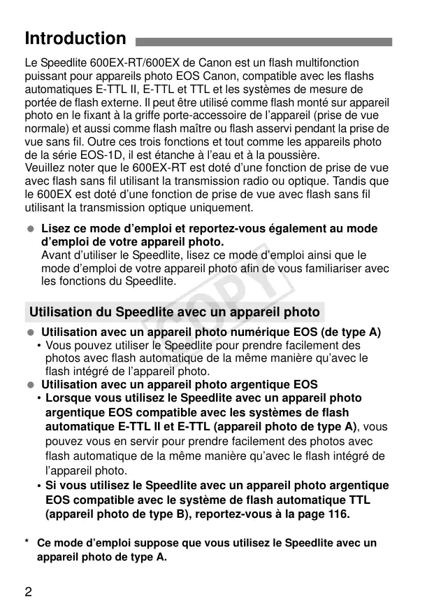 - Ce mode d'emploi suppose que vous utilisez le Speedlite avec un appareil photo de type A.