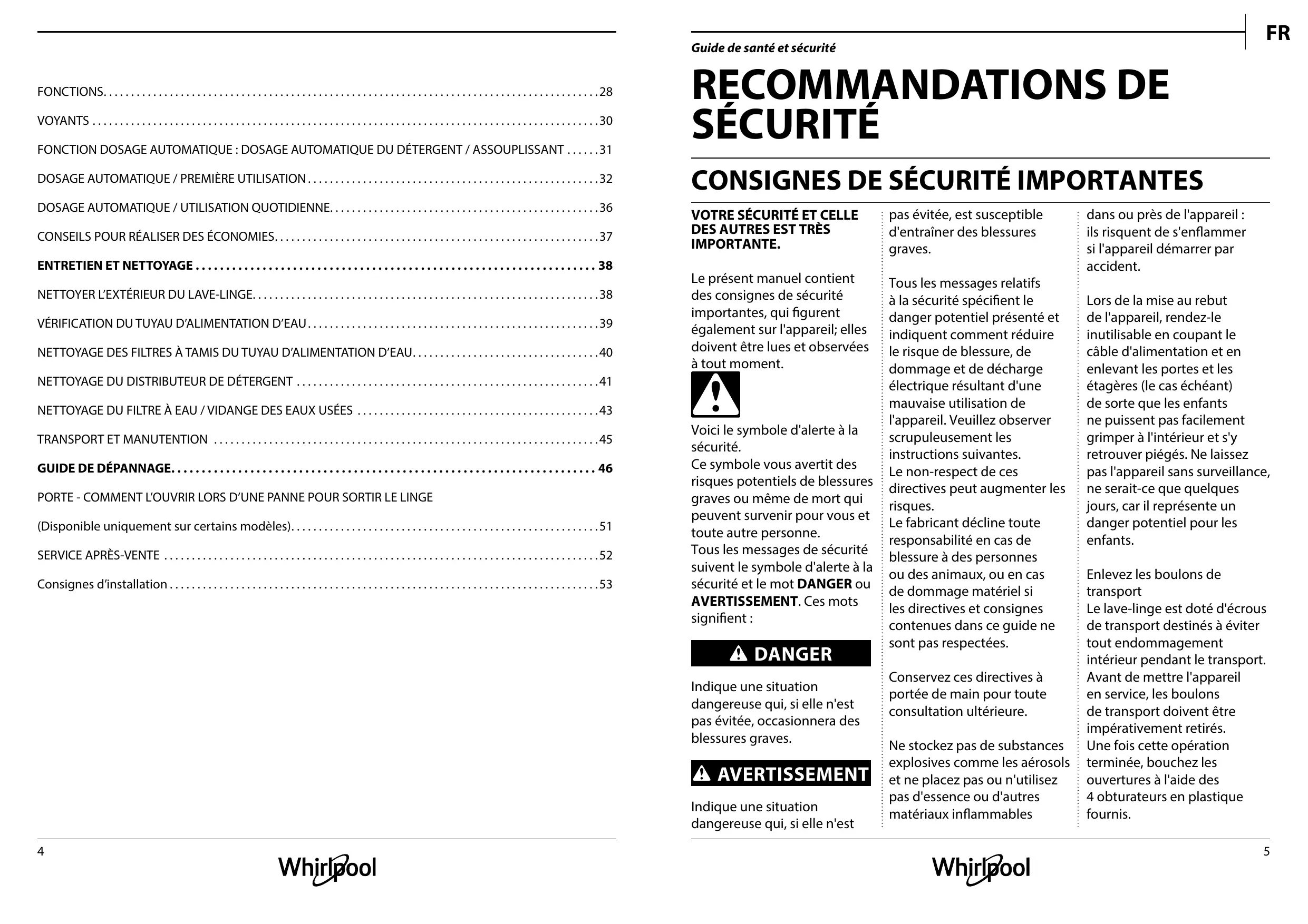 - IMPORTANTE. pas évitée, est susceptible d'entraîner des blessures graves. Le présent manuel contient des consignes de sécurité importantes, qui figurent également sur l'appareil; elles doivent être lues et observées à tout moment. Tous les messages relatifs à la sécurité spécifient le danger potentiel présenté et indiquent comment réduire le risque de blessure, de dommage et de décharge électrique résultant d'une mauvaise utilisation de l'appareil. Veuillez observer scrupuleusement les instructions suivantes. Le non-respect de ces directives peut augmenter les risques. Le fabricant décline toute responsabilité en cas de blessure à des personnes ou des animaux, ou en cas de dommage matériel si les directives et consignes contenues dans ce guide ne sont pas respectées. NETTOYAGE DU DISTRIBUTEUR DE DÉTERGENT p. 41