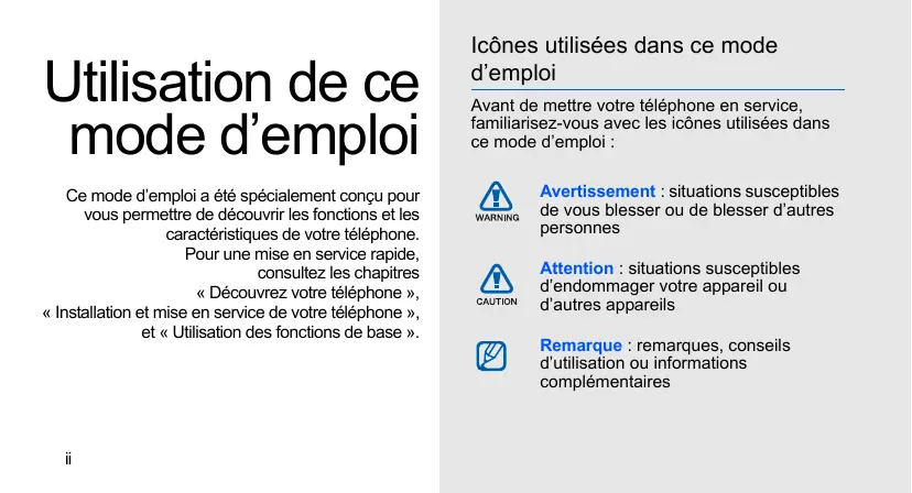Mode d’emploi Utilisation de ce mode d’emploi Ce mode d’emploi a été spécialement conçu pour vous permettre de découvrir les fonctions et les caractéristiques de votre téléphone. Pour une mise en service rapide, consultez les chapitres « Découvrez votre téléphone », « Installation et mise en service de votre téléphone », et « Utilisation des fonctions de base ».