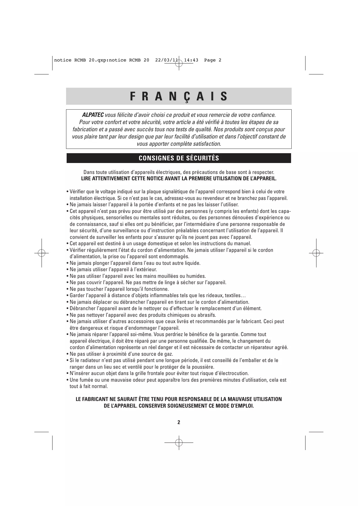 Retrouvez gratuitement la notice de l'appareil RCMB20 ALPATEC au format PDF.