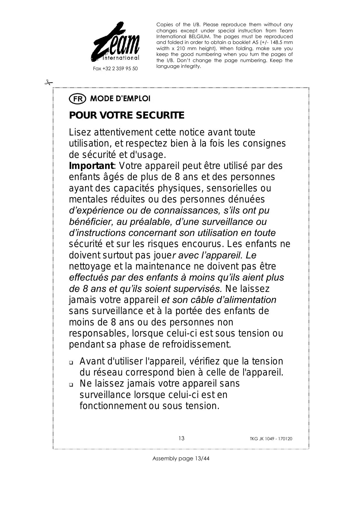 Nous, Team Kalorik Group SA/NV, confirmons par la présente que notre produit correspond aux exigences de la directive 1275/2008/CE. Notre produit n'est pas équipé d'un mode veille, car il s'éteint complètement immédiatement après avoir fini sa fonction principale et par conséquent ne consomme pas d'énergie électrique!