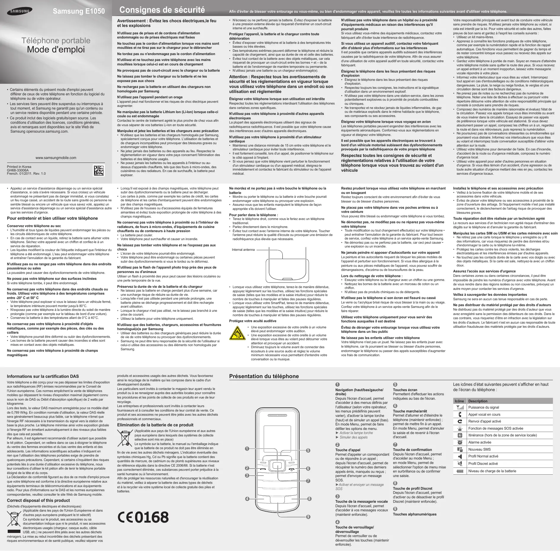 Samsung E1050 Téléphone portable Mode d'emploi Consignes de sécurité