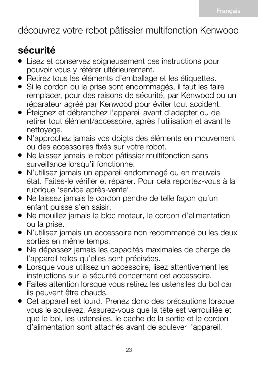 Lisez et conservez soigneusement ces instructions pour pouvoir vous y référer ultérieurement. Retirez tous les éléments d’emballage et les étiquettes. Si le cordon ou la prise sont endommagés, il faut les faire remplacer, pour des raisons de sécurité, par Kenwood ou un réparateur agréé par Kenwood pour éviter tout accident. Éteignez et débranchez l’appareil avant d’adapter ou de retirer tout élément/accessoire, après l’utilisation et avant le nettoyage. N’approchez jamais vos doigts des éléments en mouvement ou des accessoires fixés sur votre robot. Ne laissez jamais le robot pâtissier multifonction sans surveillance lorsqu’il fonctionne. N’utilisez jamais un appareil endommagé ou en mauvais état. Faites-le vérifier et réparer. Pour cela reportez-vous à la rubrique ‘service après-vente’. Ne laissez jamais le cordon pendre de telle façon qu’un enfant puisse s’en saisir. Ne mouillez jamais le bloc moteur, le cordon d’alimentation ou la prise. N’utilisez jamais un accessoire non recommandé ou les deux sorties en même temps. Ne dépassez jamais les capacités maximales de charge de l’appareil telles qu’elles sont précisées. Lorsque vous utilisez un accessoire, lisez attentivement les instructions sur la sécurité concernant cet accessoire. Faites attention lorsque vous retirez les ustensiles du bol car ils peuvent être chauds. Cet appareil est lourd. Prenez donc des précautions lorsque vous le soulevez. Assurez-vous que la tête est verrouillée et que le bol, les ustensiles, le cache de la sortie et le cordon d’alimentation sont attachés avant de soulever l’appareil. 23