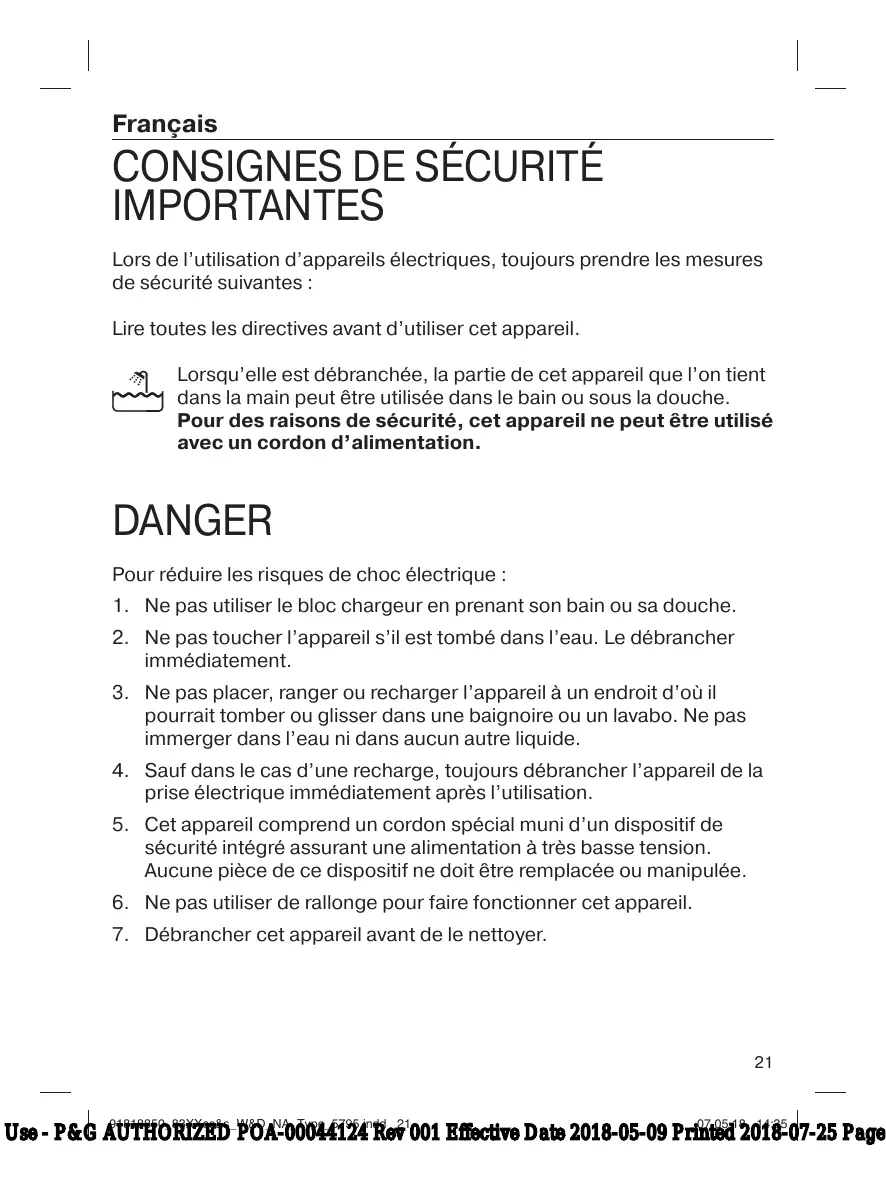 1. Ne pas utiliser le bloc chargeur en prenant son bain ou sa douche. 2. Ne pas toucher l’appareil s’il est tombé dans l’eau. Le débrancher immédiatement. 3. Ne pas placer, ranger ou recharger l’appareil à un endroit d’où il pourrait tomber ou glisser dans une baignoire ou un lavabo. Ne pas immerger dans l’eau ni dans aucun autre liquide. 4. Sauf dans le cas d’une recharge, toujours débrancher l’appareil de la prise électrique immédiatement après l’utilisation. 5. Cet appareil comprend un cordon spécial muni d’un dispositif de sécurité intégré assurant une alimentation à très basse tension. Aucune pièce de ce dispositif ne doit être remplacée ou manipulée. 6. Ne pas utiliser de rallonge pour faire fonctionner cet appareil. 7. Débrancher cet appareil avant de le nettoyer.