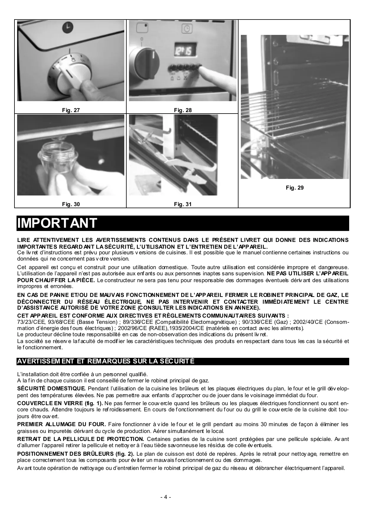Fig. 27 Fig. 28 Fig. 29 Fig. 30 Fig. 31 IMPORTANT LIRE ATTENTIVEMENT LES AVERTISSEMENTS CONTENUS DANS LE PRÉSENT LIVRET QUI DONNE DES INDICATIONS IMPORTANTE S REGARD ANT LA SÉCURITÉ, L’UTILISATION ET L’ENTRETIEN DE L’APP AREIL. Ce liv ret d’instructions est prévu pour plusieurs v ersions de cuisines. Il est possible que le manuel contienne certaines instructions ou données qui ne concernent pas v otre version. Cet appareil est conçu et construit pour une utilisation domestique. Toute autre utilisation est considérée impropre et dangereuse. L’utilisation de l’appareil n’est pas autorisée aux enf ants ou aux personnes inaptes sans supervision. NE PAS UTILISER L’APP AREIL POUR CHAUFFER LA PIÈCE. Le constructeur ne sera pas tenu pour responsable des dommages éventuels dériv ant des utilisations impropres et erronées. EN CAS DE PANNE ET/OU DE MAUV AIS FONCTIONNEMENT DE L’APP AREIL FERMER LE ROBINET PRINCIPAL DE GAZ, LE DÉCONNECTER DU RÉSEAU ÉLECTRIQUE, NE PAS INTERVENIR ET CONTACTER IMMÉDI ATE MENT LE CENTRE D’ASSISTANCE AUTORISÉ DE VOTRE ZONE (CONSULTER LES INDICATIONS EN ANNEXE). CET APP AREIL EST CONFORME AUX DIRECTIVES ET RÈGLEMENTS COMMUNAUTAIRES SUIVANTS : 73/23/CEE, 93/68/CEE (Basse Tension) ; 89/336/CEE (Compatibilité Electomagnétique) ; 90/336/CEE (Gaz) ; 2002/40/CE (Consommation d’énergie des f ours électriques) ; 2002/96/CE (RAEE),1935/2004/CE (matériels en contact avec les aliments). Le producteur décline toute responsabilité en cas de non-observation des indications du présent liv ret. La société se réserv e la f aculté de modif ier les caractéristiques techniques des produits en respectant dans tous les cas la sécurité et le f onctionnement. AVERTISSEM ENT ET REMARQUES SUR LA SÉCURIT É L’installation doit être confiée à un personnel qualifié. A la f in de chaque cuisson il est conseillé de fermer le robinet principal de gaz. SÉCURITÉ DOMESTIQUE. Pendant l’utilisation de la cuisine les brûleurs et les plaques électriques du plan, le four et le grill dév eloppent des températures élevées. Ne pas permettre aux enfants d’approcher ou de jouer dans le voisinage immédiat du four. COUVERCLE EN VERRE (fig. 1). Ne pas fermer le couv ercle quand les brûleurs ou les plaques électriques fonctionnent ou sont encore chauds. Attendre toujours le ref roidissement. En cours de f onctionnement du f our ou du grill le couv ercle de la cuisine doit toujours être ouv ert. PREMIER ALLUMAGE DU FOUR. Faire fonctionner à v ide le f our et le grill pendant au moins 30 minutes de façon à éliminer les graisses ou impuretés dérivant du cycle de production. Aérer simultanément le local. RETRAIT DE LA PELLICULE DE PROTECTION. Certaines parties de la cuisine sont protégées par une pellicule spéciale. Av ant d’allumer l’appareil retirer la pellicule et nettoy er à l’eau tiède savonneuse les résidus de colle év entuels. POSITIONNEMENT DES BRÛLEURS (fig. 2). Le plan de cuisson est doté de repères. Après le retrait pour nettoy age, remettre en place correctement tous les composants pour év iter un mauvais f onctionnement ou des dommages. Av ant toute opération de nettoyage ou d’entretien fermer le robinet principal de gaz du réseau et débrancher électriquement l’appareil.