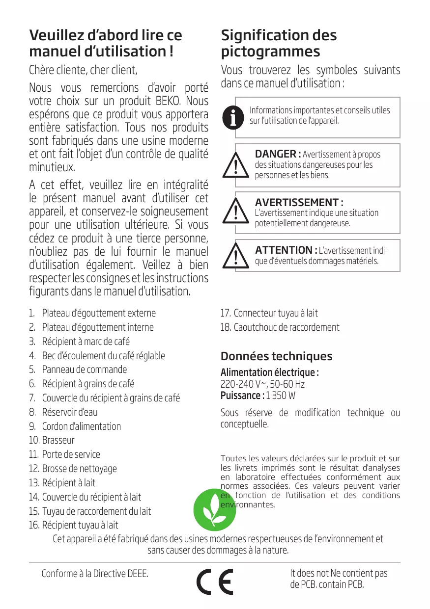 Chère cliente, cher client, Vous trouverez les symboles suivants Nous vous remercions d’avoir porté dans ce manuel d’utilisation : votre choix sur un produit BEKO. Nous Informations importantes et conseils utiles espérons que ce produit vous apportera sur l'utilisation de l'appareil. entière satisfaction. Tous nos produits sont fabriqués dans une usine moderne DANGER : Avertissement à propos et ont fait l’objet d’un contrôle de qualité des situations dangereuses pour les minutieux. personnes et les biens. A cet effet, veuillez lire en intégralité le présent manuel avant d’utiliser cet AVERTISSEMENT : appareil, et conservez-le soigneusement L’avertissement indique une situation potentiellement dangereuse. pour une utilisation ultérieure. Si vous cédez ce produit à une tierce personne, ATTENTION : L’avertissement indin’oubliez pas de lui fournir le manuel que d’éventuels dommages matériels. d’utilisation également. Veillez à bien respecter les consignes et les instructions figurants dans le manuel d’utilisation. 1. Plateau d’égouttement externe 17. Connecteur tuyau à lait 2. Plateau d’égouttement interne 18. Caoutchouc de raccordement 3. Récipient à marc de café 4. Bec d’écoulement du café réglable Données techniques 5. Panneau de commande Alimentation électrique : 6. Récipient à grains de café 220-240 V~, 50-60 Hz Puissance : 1 350 W 7. Couvercle du récipient à grains de café 8. Réservoir d’eau Sous réserve de modification technique ou conceptuelle. 9. Cordon d'alimentation 10. Brasseur 11. Porte de service Toutes les valeurs déclarées sur le produit et sur les livrets imprimés sont le résultat d'analyses 12. Brosse de nettoyage en laboratoire effectuées conformément aux 13. Récipient à lait normes associées. Ces valeurs peuvent varier en fonction de l'utilisation et des conditions 14. Couvercle du récipient à lait environnantes. 15. Tuyau de raccordement du lait 16. Récipient tuyau à lait Cet appareil a été fabriqué dans des usines modernes respectueuses de l’environnement et sans causer des dommages à la nature. Conforme à la Directive DEEE.