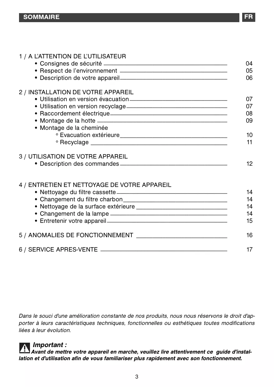 -Cet appareil a été conçu pour être utilisé par des particuliers dans leur lieu d'habitation. - Cet appareil n'est pas prévu pour être utilisé par des personnes (y compris les enfants) dont les capacités physiques, sensorielles ou mentales sont réduites, ou des personnes dénuées d'expérience ou de connaissance, sauf si elles ont pu bénéficier, par l'intermédiaire d'une personne responsable de leur sécurité, de surveillance ou d'instructions préalables concernant l'utilisation de l'appareil. Il convient de surveiller les enfants pour s'assurer qu'ils ne jouent pas avec l'appareil. - À la réception de l'appareil, déballez-le ou faites-le déballer immédiatement. Vérifiez son aspect général. Faites les éventuelles réserves par écrit sur le bon de livraison dont vous gardez un exemplaire. - Votre appareil est destiné à un usage domestique normal. Ne l'utilisez pas à des fins commerciales ou industrielles ou pour d'autres buts que celui pour lequel il a été conçu. - Ne modifiez pas ou n'essayez pas de modifier les caractéristiques de cet appareil. Cela représentait un danger pour vous. - Les réparations doivent être exclusivement effectuées par un spécialiste agréé. - Débranchez toujours la hotte avant de procéder à son nettoyage ou à son entretien. - Aérez convenablement la pièce en cas de fonctionnement simultané de la hotte et d'autres appareils alimentés par une source d'énergie différente de l'énergie électrique. Ceci afin que la hotte n'aspire pas les gaz de combustion. - Il est interdit de flamber des mets ou de faire fonctionner des foyers gaz sans récipients.
