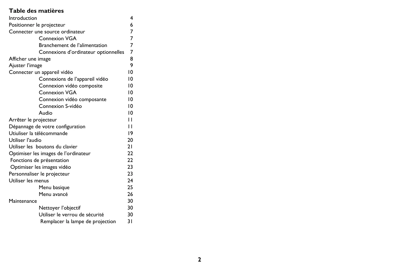 Votre nouveau projecteur numérique est simple à connecter, facile à utiliser et commode à entretenir. C'est un projecteur complet qui est assez flexible pour les présentations commerciales et également pour l'affichage vidéo domestique. L'IN122 a une résolution native SVGA de 800 × 600, l'IN124 a une résolution native XGA de 1024 × 768, et l'IN126 a une résolution WXGA de 1280 × 800. Ils sont compatibles avec une grande variété d'ordinateurs et d'appareils vidéo.