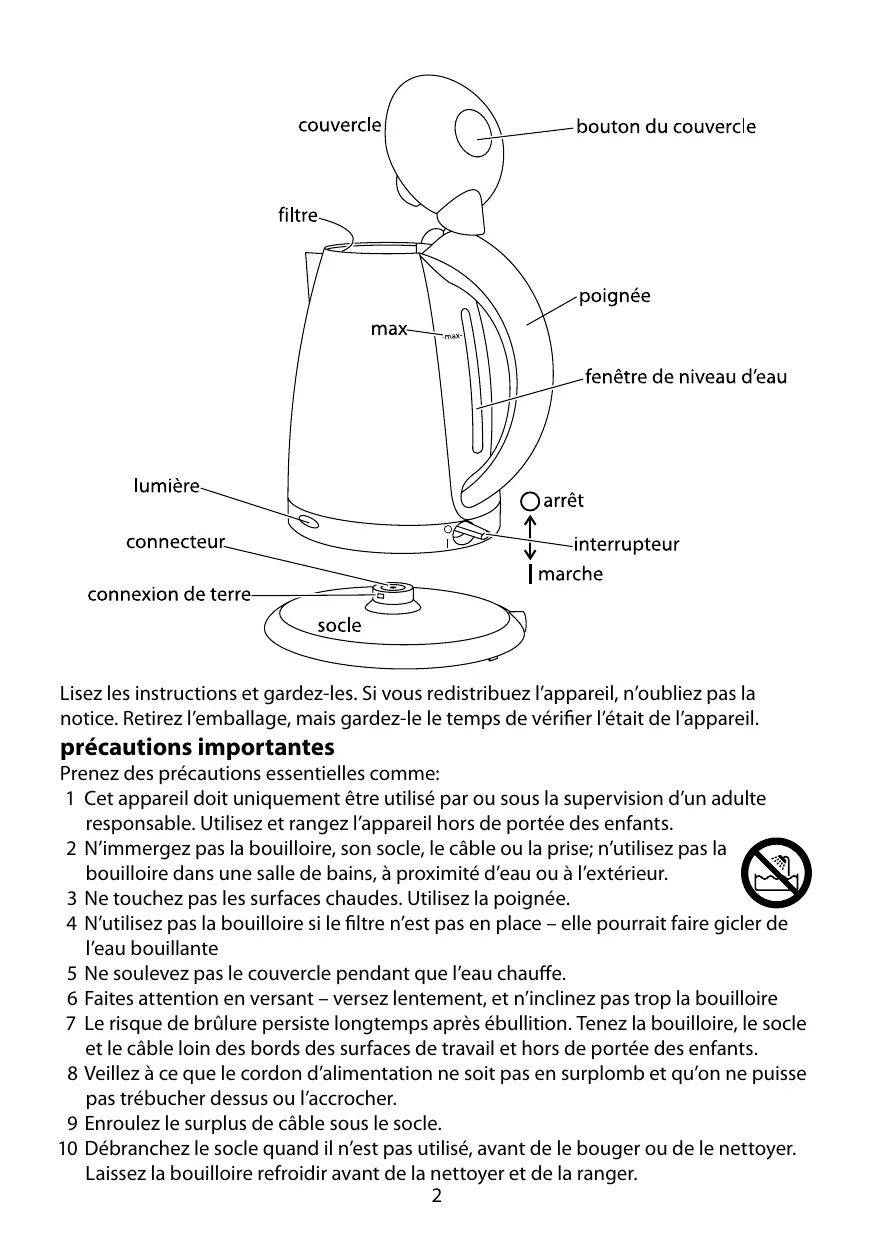1 Cet appareil doit uniquement être utilisé par ou sous la supervision d'un adulte responsable. Utilisez et rangez l'appareil hors de portée des enfants. 2 N'immergez pas la bouilloire, son socle, le câble ou la prise ; n'utilisez pas la bouilloire dans une salle de bains, à proximité d'eau ou à l'extérieur. 3 Ne touchez pas les surfaces chaudes. Utilisez la poignée. 4 N'utilisez pas la bouilloire si le filtre n'est pas en place - elle pourrait faire gicler de l'eau bouillante. 5 Ne soulevez pas le couvercle pendant que l'eau chauffe. 6 Faites attention en versant - versez lentement, et n'inclinez pas trop la bouilloire. 7 Le risque de brûlure persiste longtemps après ébullition. Tenez la bouilloire, le socle et le câble loin des bords des surfaces de travail et hors de portée des enfants. 8 Veillez à ce que le cordon d'alimentation ne soit pas en surplomb et qu'on ne puisse pas trébucher dessus ou l'accrocher. 9 Enroulez le surplus de câble sous le socle. 10 Débranchez le socle quand il n'est pas utilisé, avant de le bouger ou de le nettoyer. Laissez la bouilloire refroidir avant de la nettoyer et de la ranger.