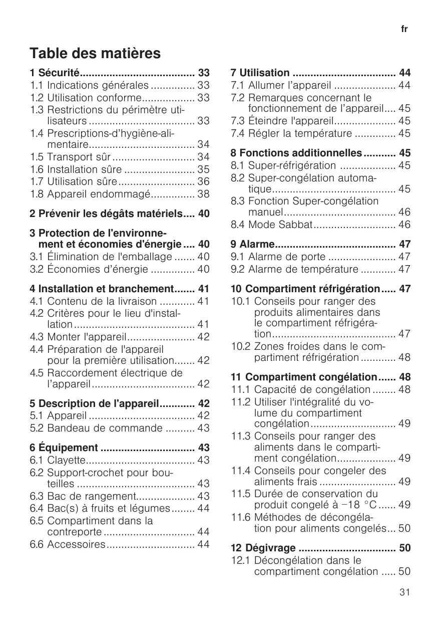 7 Utilisation 44 7.1 Allumer l’appareil 44 7.2 Remarques concernant le fonctionnement de l’appareil.... 45 7.3 Éteindre l'appareil 45 7.4 Régler la température 45 8 Fonctions additionnelles 45 8.1 Super-réfrigération 45 8.2 Super-congélation automatique 45 8.3 Fonction Super-congélation manuel 46 8.4 Mode Sabbat 46 9 Alarme 47 9.1 Alarme de porte 47 9.2 Alarme de température 47 10 Compartiment réfrigération 47 10.1 Conseils pour ranger des produits alimentaires dans le compartiment réfrigération 47 10.2 Zones froides dans le compartiment réfrigération 48 11 Compartiment congélation 48 11.1 Capacité de congélation 48 11.2 Utiliser l'intégralité du volume du compartiment congélation 49 11.3 Conseils pour ranger des aliments dans le compartiment congélation 49 11.4 Conseils pour congeler des aliments frais 49 11.5 Durée de conservation du produit congelé à −18 °C 49 11.6 Méthodes de décongélation pour aliments congelés... 50 12 Dégivrage 50 12.1 Décongélation dans le compartiment congélation 50 31