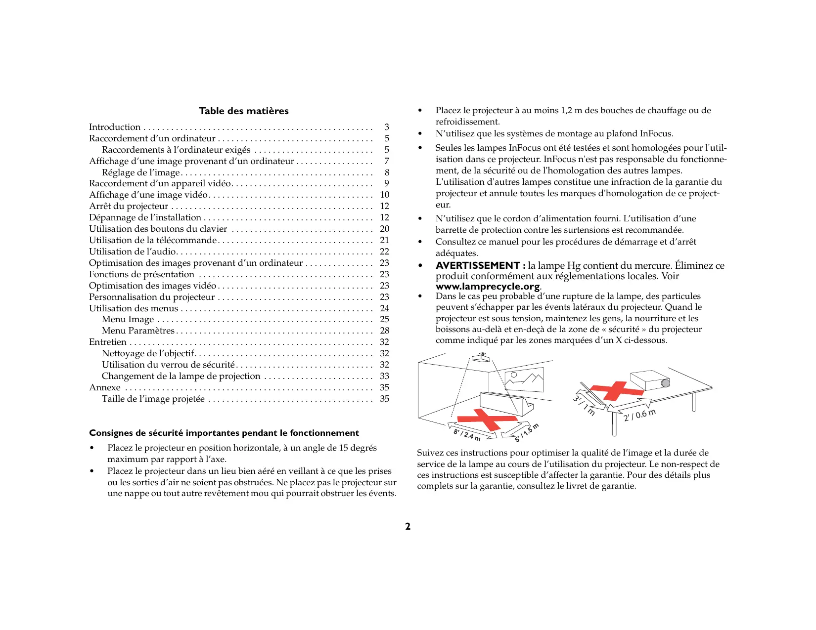 Suivez ces instructions pour optimiser la qualité de l'image et la durée de service de la lampe au cours de l'utilisation du projecteur. Le non-respect de ces instructions est susceptible d'affecter la garantie. Pour des détails plus complets sur la garantie, consultez le livre de garantie.