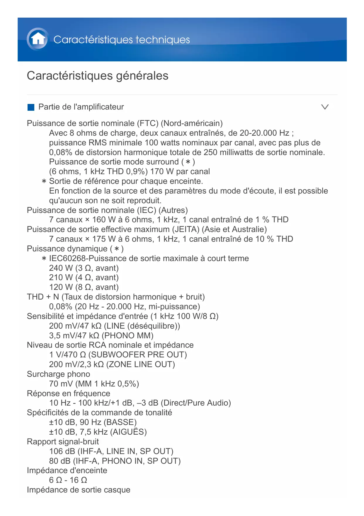 | Puissance | 120 W par canal (8 ohms, 20 Hz - 20 kHz, 0,08 % THD) |