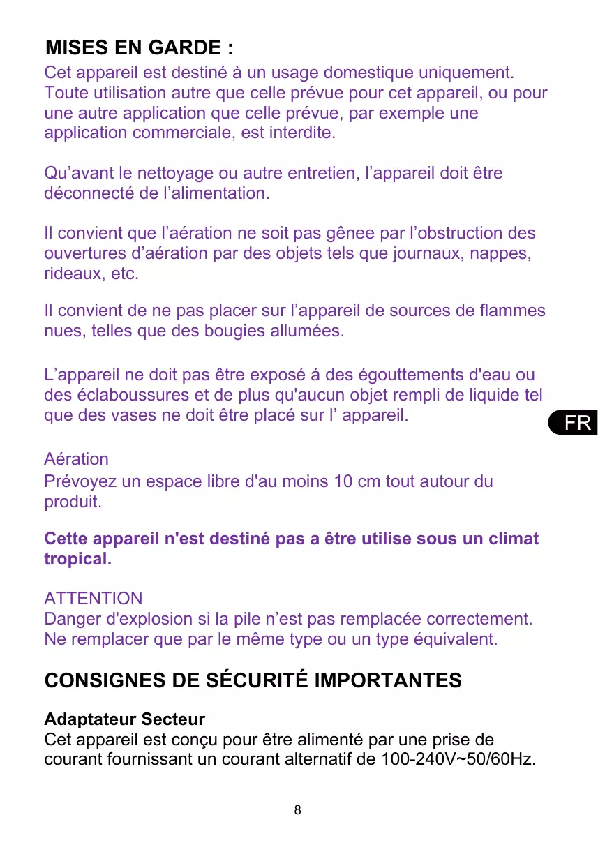 MISES EN GARDE : Cet appareil est destiné à un usage domestique uniquement. Toute utilisation autre que celle prévue pour cet appareil, ou pour une autre application que celle prévue, par exemple une application commerciale, est interdite. Qu’avant le nettoyage ou autre entretien, l’appareil doit être déconnecté de l’alimentation. Il convient que l’aération ne soit pas gênee par l’obstruction des ouvertures d’aération par des objets tels que journaux, nappes, rideaux, etc. Il convient de ne pas placer sur l’appareil de sources de flammes nues, telles que des bougies allumées. L’appareil ne doit pas être exposé á des égouttements d'eau ou des éclaboussures et de plus qu'aucun objet rempli de liquide tel que des vases ne doit être placé sur l’ appareil. Aération Prévoyez un espace libre d'au moins 10 cm tout autour du produit. Cette appareil n'est destiné pas a être utilise sous un climat tropical. ATTENTION Danger d'explosion si la pile n’est pas remplacée correctement. Ne remplacer que par le même type ou un type équivalent.