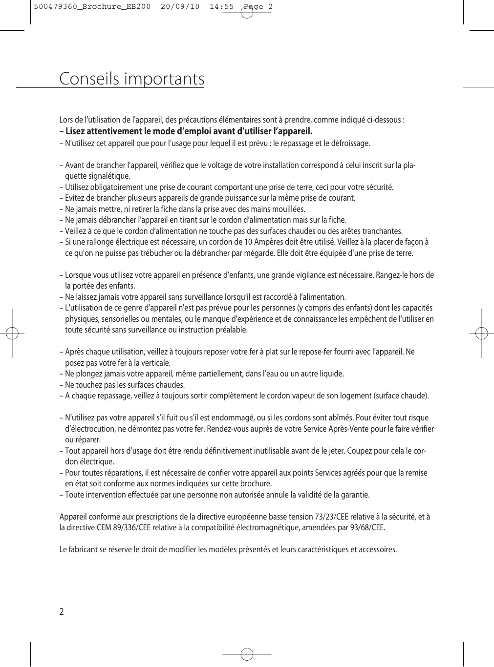 500479360_Brochure_EB200 20/09/10 Brochure d'instructions 14:55 Page 1 500479360_Brochure_EB200 20/09/10 14:55 Page 2 Conseils importants Lors de l'utilisation de l'appareil, des précautions élémentaires sont à prendre, comme indiqué ci-dessous : – Lisez attentivement le mode d’emploi avant d’utiliser l’appareil. – N’utilisez cet appareil que pour l’usage pour lequel il est prévu : le repassage et le défroissage. – Avant de brancher l’appareil, vérifiez que le voltage de votre installation correspond à celui inscrit sur la plaquette signalétique. – Utilisez obligatoirement une prise de courant comportant une prise de terre, ceci pour votre sécurité. – Evitez de brancher plusieurs appareils de grande puissance sur la même prise de courant. – Ne jamais mettre, ni retirer la fiche dans la prise avec des mains mouillées. – Ne jamais débrancher l’appareil en tirant sur le cordon d’alimentation mais sur la fiche. – Veillez à ce que le cordon d’alimentation ne touche pas des surfaces chaudes ou des arêtes tranchantes. – Si une rallonge électrique est nécessaire, un cordon de 10 Ampères doit être utilisé. Veillez à la placer de façon à ce qu’on ne puisse pas trébucher ou la débrancher par mégarde. Elle doit être équipée d’une prise de terre. – Lorsque vous utilisez votre appareil en présence d’enfants, une grande vigilance est nécessaire. Rangez-le hors de la portée des enfants. – Ne laissez jamais votre appareil sans surveillance lorsqu’il est raccordé à l’alimentation. – L'utilisation de ce genre d'appareil n'est pas prévue pour les personnes (y compris des enfants) dont les capacités physiques, sensorielles ou mentales, ou le manque d'expérience et de connaissance les empêchent de l'utiliser en toute sécurité sans surveillance ou instruction préalable. – Après chaque utilisation, veillez à toujours reposer votre fer à plat sur le repose-fer fourni avec l’appareil. Ne posez pas votre fer à la verticale. – Ne plongez jamais votre appareil, même partiellement, dans l’eau ou un autre liquide. – Ne touchez pas les surfaces chaudes. – A chaque repassage, veillez à toujours sortir complètement le cordon vapeur de son logement (surface chaude). – N’utilisez pas votre appareil s’il fuit ou s’il est endommagé, ou si les cordons sont abîmés. Pour éviter tout risque d’électrocution, ne démontez pas votre fer. Rendez-vous auprès de votre Service Après-Vente pour le faire vérifier ou réparer. – Tout appareil hors d’usage doit être rendu définitivement inutilisable avant de le jeter. Coupez pour cela le cordon électrique. – Pour toutes réparations, il est nécessaire de confier votre appareil aux points Services agréés pour que la remise en état soit conforme aux normes indiquées sur cette brochure. – Toute intervention effectuée par une personne non autorisée annule la validité de la garantie. Appareil conforme aux prescriptions de la directive européenne basse tension 73/23/CEE relative à la sécurité, et à la directive CEM 89/336/CEE relative à la compatibilité électromagnétique, amendées par 93/68/CEE. Le fabricant se réserve le droit de modifier les modèles présentés et leurs caractéristiques et accessoires.