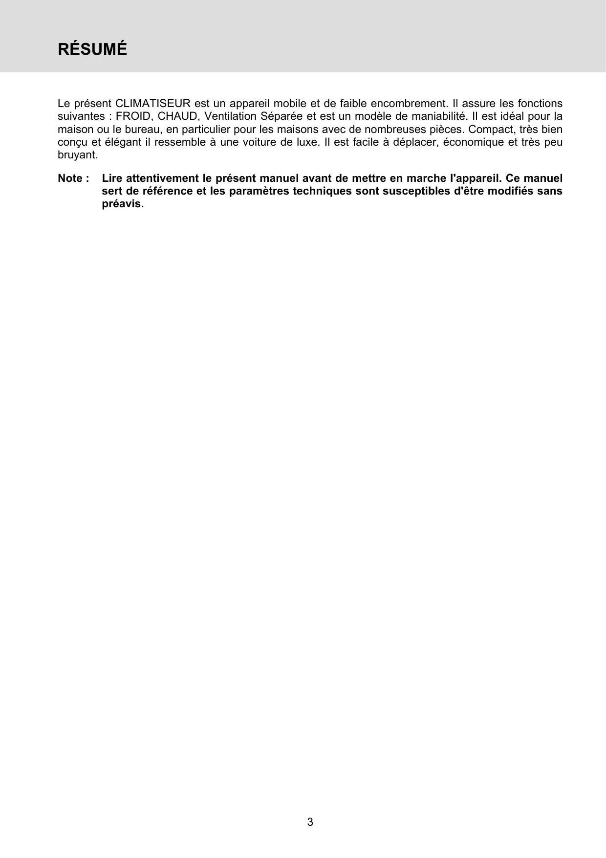 Note : Lire attentivement le présent manuel avant de mettre en marche l'appareil. Ce manuel est de référence et les paramètres techniques sont susceptibles d'être modifiés sans préavis.