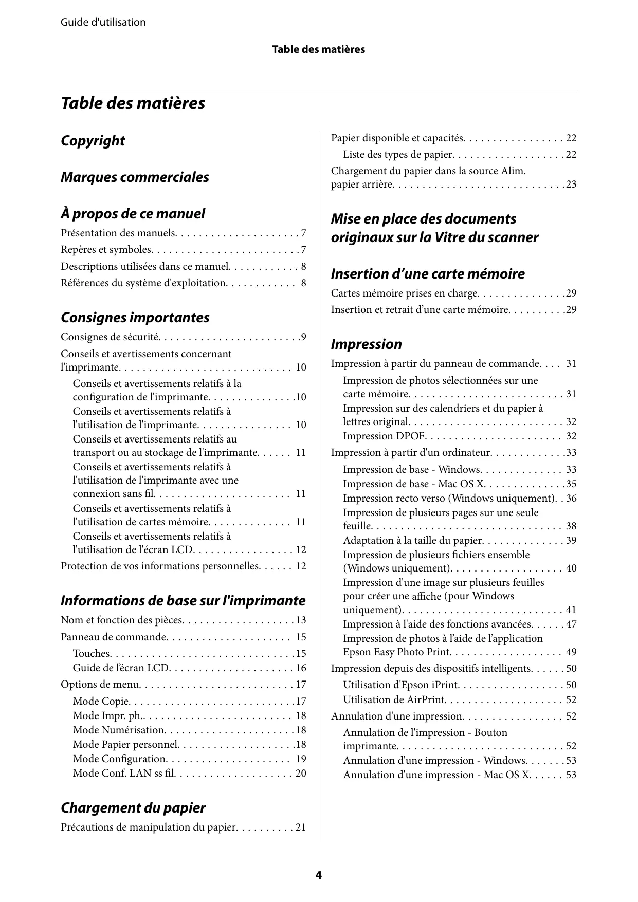 - Utilisation d'Epson iPrint p. 50