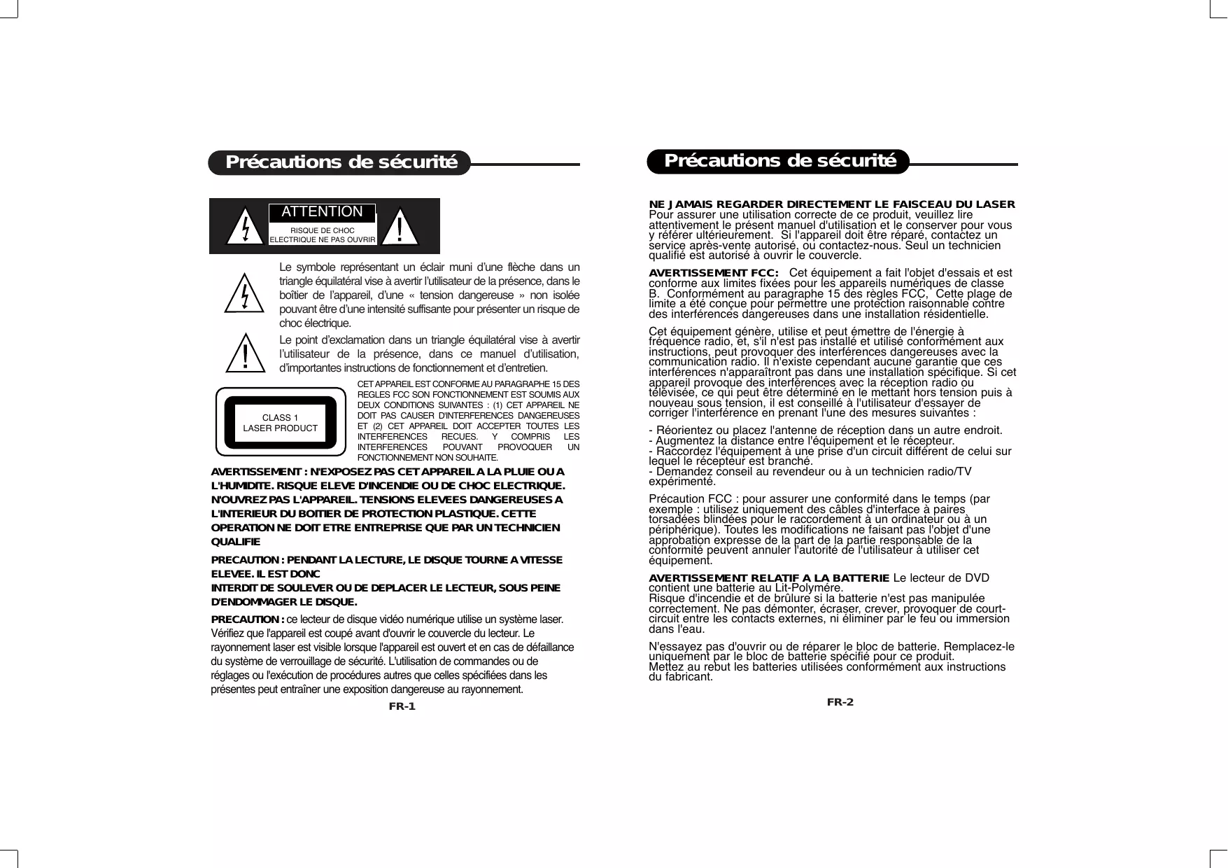 PRECAUTION : ce lecteur de disque video numérique utilise un système laser. Vérifie que l'appareil est coupé avant d'ouvrir le couvercle du lecteur. Le rayonnement laser est visible lorsque l'appareil est ouvert et en cas de défaillance du système de verrouillage de sécurité. L'utilisation de commandes ou de réglages ou l'exécution de procédures autres que celles spécifiées dans les générées peut entraîner une exposition dangereuse au rayonnement.