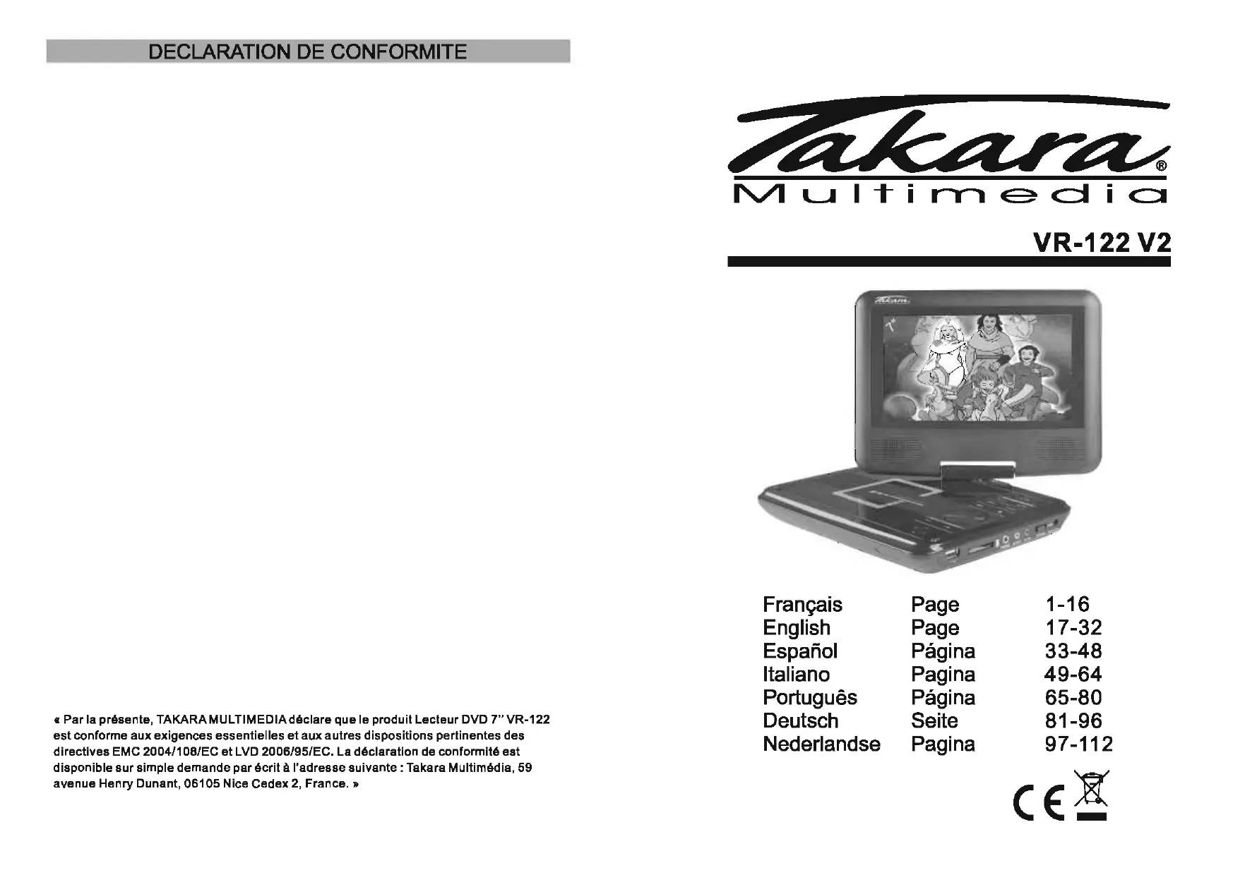 Par la présente, TAKARA MULTIMEDIA déclare que le produit Lecteur DVD 7" VR-122 est conforme aux exigences essentielles et aux autres dispositions pertinentes des directives EMC 2004/108/EC et LVD 2006/95/EC. La déclaration de conformité est disponible sur simple demande par écrit à l'adresse suivante : Takara Multimédia, 59 avenue Henry Dunant, 06105 Nice Cedex 2, France.