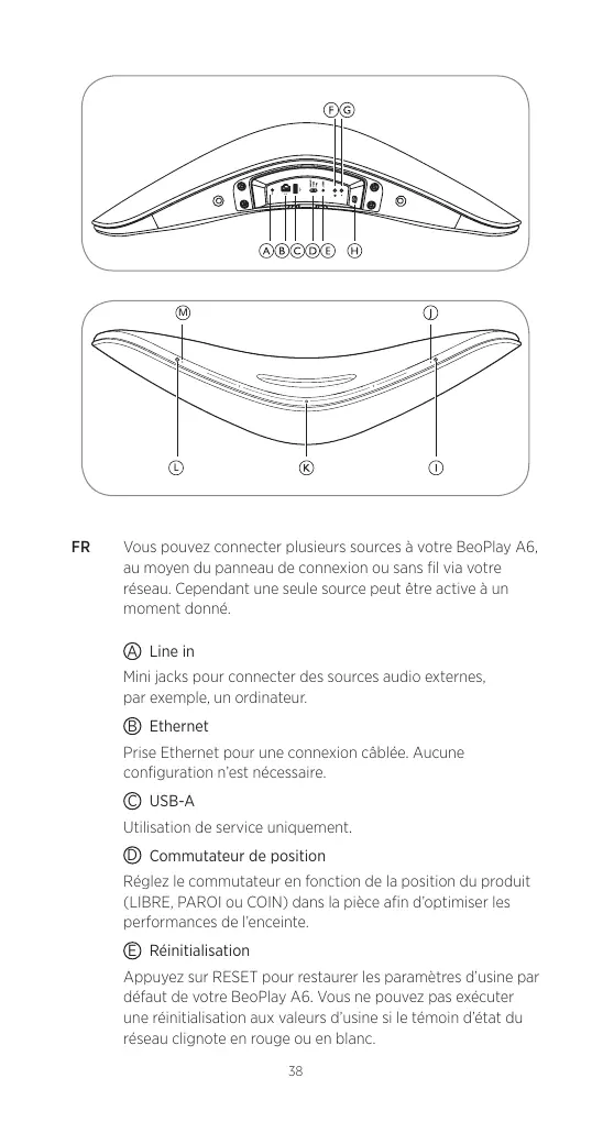 Appuyez sur RESET pour restaurer les paramètres d'usine par défaut de votre BeoPlay A6. Vous ne pouvez pas executer une réinitialisation aux valeurs d'usine si le témoins'état du réseau clignote en rouge ou en blanc.
