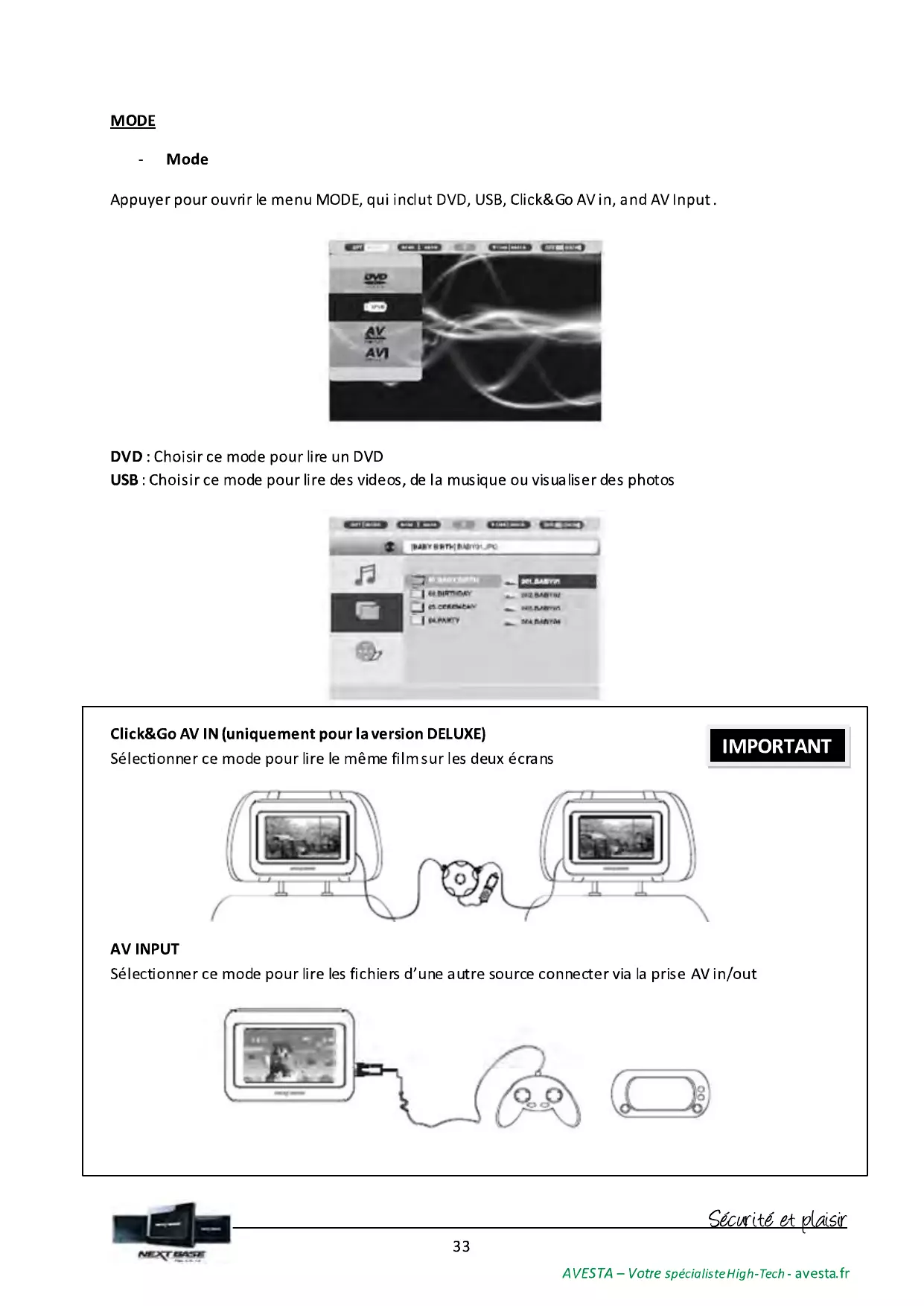| Fonction Click&Go AV IN | Lecture simultanée sur deux écrans (version Deluxe uniquement) |