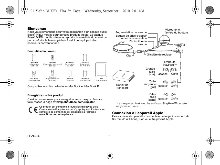 Nous vous remercions pour votre acquisition d'un casque audio Bose® MIE2i mobile pour certains produits Apple. Le casque Bose® MIE2i mobile offre une reproduction réaliste du son et un port confortable bien supérieur à celui de la plupart des écouteurs conventionnels.