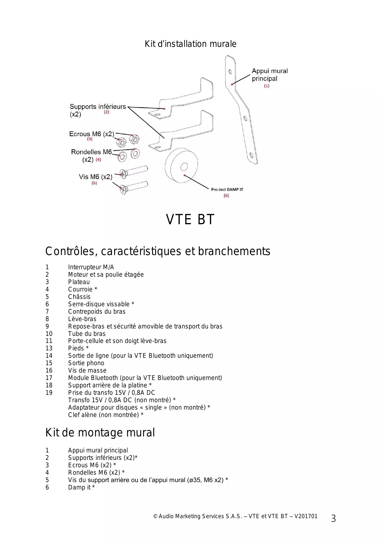 1 Interrupteur M/A 2 Moteur et sa poulie étage 3 Plateau 4 Courroie* 5 Chassis 6 Serre-disque vissable * 7 Contrepoids du bras 8 Lève-bras 9 Repose-bras et sécurité amovible de transport du bras 10 Tube du bras 11 Portecellule et son doigt lève-bras 13 Pieds* 14 Sortie de ligne (pour la VTE Bluetooth uniquement) 15 Sortie phono 16 Vis de masse 17 Module Bluetooth (pour la VTE Bluetooth uniquement) 18 Support arrête de la platine * 19 Prise du transfo 15V / 0,8A DC