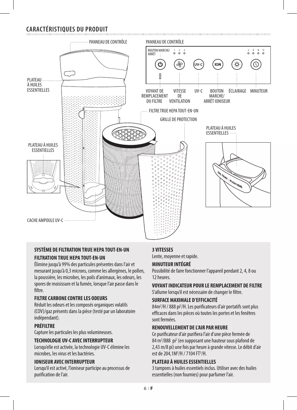 3 VITESSES Lente, moyenne et rapide. MINUTEUR INTÉGRÉ Possibilité de faire fonctionner l’appareil pendant 2, 4, 8 ou 12 heures. VOYANT INDICATEUR POUR LE REMPLACEMENT DE FILTRE S’allume lorsqu’il est nécessaire de changer le filtre. SURFACE MAXIMALE D’EFFICACITÉ 84m2/H / 888 pi2/H. Les purificateurs d’air portatifs sont plus efficaces dans les pièces où toutes les portes et les fenêtres sont fermées. RENOUVELLEMENT DE L’AIR PAR HEURE Ce purificateur d’air purifiera l’air d’une pièce fermée de 84 m2/888 pi2 (en supposant une hauteur sous plafond de 2,43 m/8 pi) une fois par heure à grande vitesse. Le débit d’air est de 204,1M3/H / 7104 FT3/H. PLATEAU À HUILES ESSENTIELLES 3 tampons à huiles essentiels inclus. Utiliser avec des huiles essentielles (non fournies) pour parfumer l’air.