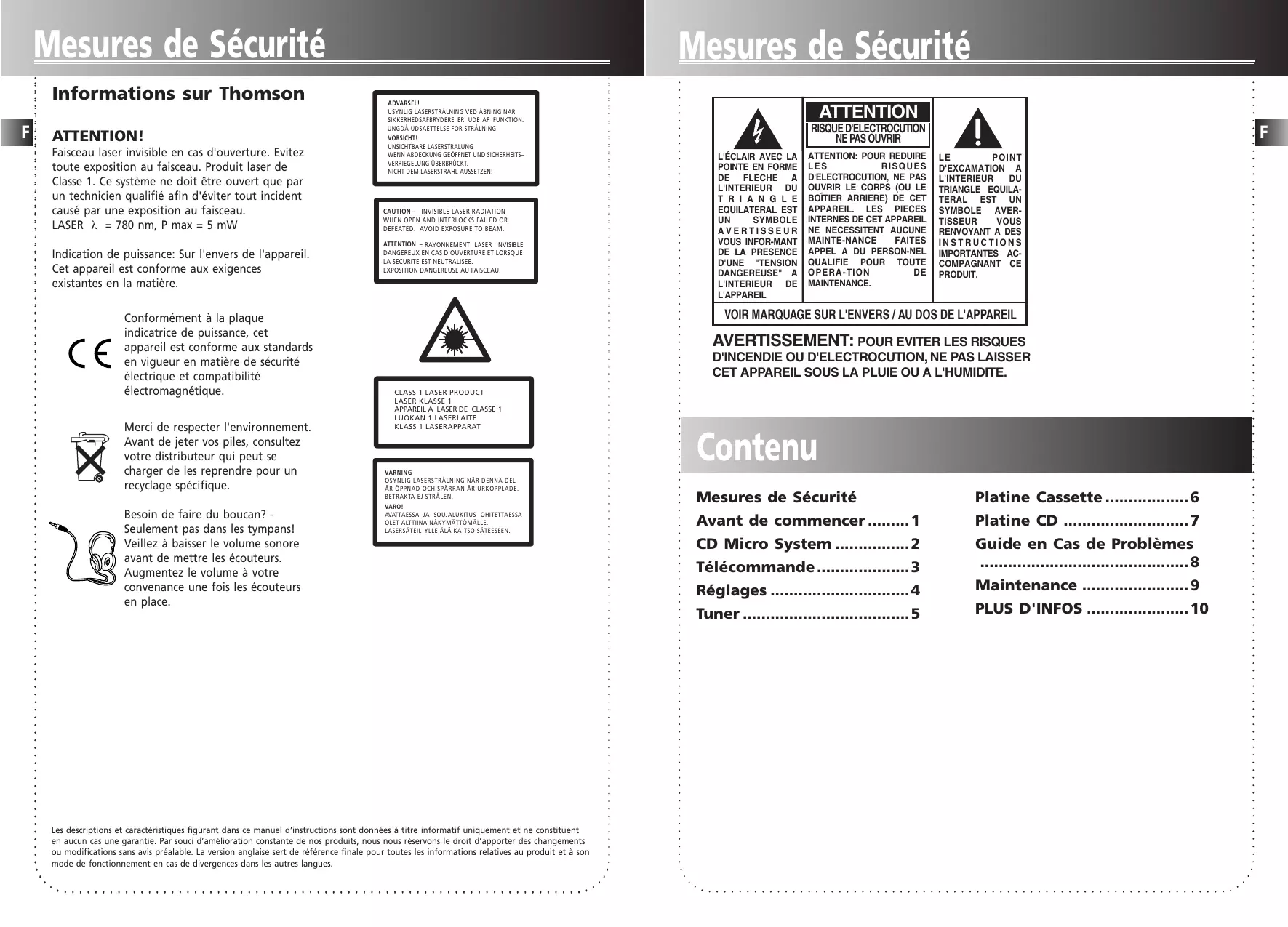 - OLET ALTTIINA NÄKYMÄTTÖMÄLLE. LASERSÄTEIL YLLE ÄLÄ KA TSO SÄTEESEEN. Les descriptions et caractéristiques figurant dans ce manuel d’instructions sont données à titre informatif uniquement et ne constituent en aucun cas une garantie. Par souci d’amélioration constante de nos produits, nous nous réservons le droit d’apporter des changements ou modifications sans avis préalable. La version anglaise sert de référence finale pour toutes les informations relatives au produit et à son mode de fonctionnement en cas de divergences dans les autres langues. Contenu Mesures de Sécurité Platine Cassette p. 6