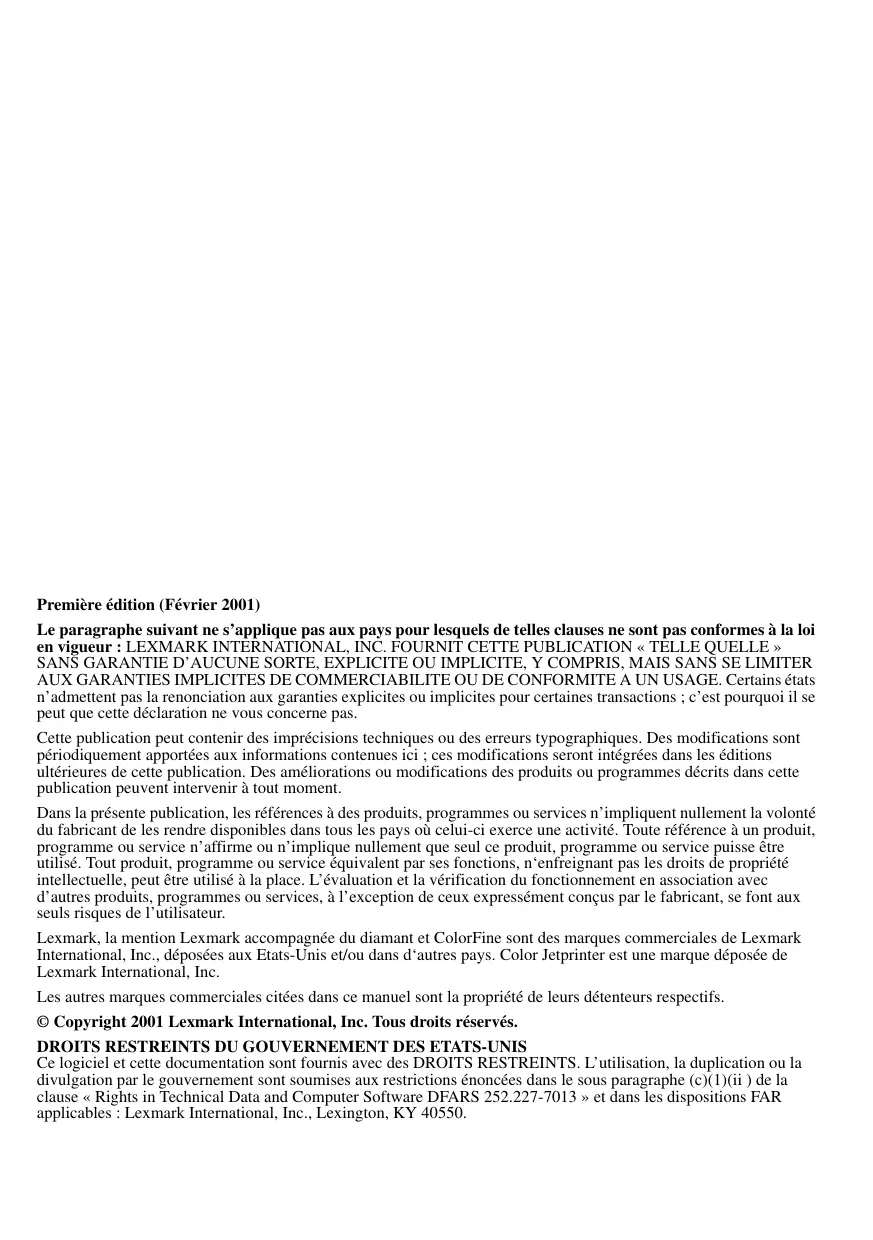 Première édition (Février 2001) Le paragraphe suivant ne s’applique pas aux pays pour lesquels de telles clauses ne sont pas conformes à la loi en vigueur : LEXMARK INTERNATIONAL, INC. FOURNIT CETTE PUBLICATION « TELLE QUELLE » SANS GARANTIE D’AUCUNE SORTE, EXPLICITE OU IMPLICITE, Y COMPRIS, MAIS SANS SE LIMITER AUX GARANTIES IMPLICITES DE COMMERCIABILITE OU DE CONFORMITE A UN USAGE. Certains états n’admettent pas la renonciation aux garanties explicites ou implicites pour certaines transactions ; c’est pourquoi il se peut que cette déclaration ne vous concerne pas. Cette publication peut contenir des imprécisions techniques ou des erreurs typographiques. Des modifications sont périodiquement apportées aux informations contenues ici ; ces modifications seront intégrées dans les éditions ultérieures de cette publication. Des améliorations ou modifications des produits ou programmes décrits dans cette publication peuvent intervenir à tout moment. Dans la présente publication, les références à des produits, programmes ou services n’impliquent nullement la volonté du fabricant de les rendre disponibles dans tous les pays où celui-ci exerce une activité. Toute référence à un produit, programme ou service n’affirme ou n’implique nullement que seul ce produit, programme ou service puisse être utilisé. Tout produit, programme ou service équivalent par ses fonctions, n‘enfreignant pas les droits de propriété intellectuelle, peut être utilisé à la place. L’évaluation et la vérification du fonctionnement en association avec d’autres produits, programmes ou services, à l’exception de ceux expressément conçus par le fabricant, se font aux seuls risques de l’utilisateur. Lexmark, la mention Lexmark accompagnée du diamant et ColorFine sont des marques commerciales de Lexmark International, Inc., déposées aux Etats-Unis et/ou dans d‘autres pays. Color Jetprinter est une marque déposée de Lexmark International, Inc. Les autres marques commerciales citées dans ce manuel sont la propriété de leurs détenteurs respectifs. © Copyright 2001 Lexmark International, Inc. Tous droits réservés. DROITS RESTREINTS DU GOUVERNEMENT DES ETATS-UNIS Ce logiciel et cette documentation sont fournis avec des DROITS RESTREINTS. L’utilisation, la duplication ou la divulgation par le gouvernement sont soumises aux restrictions énoncées dans le sous paragraphe (c)(1)(ii ) de la clause « Rights in Technical Data and Computer Software DFARS 252.227-7013 » et dans les dispositions FAR applicables : Lexmark International, Inc., Lexington, KY 40550.
