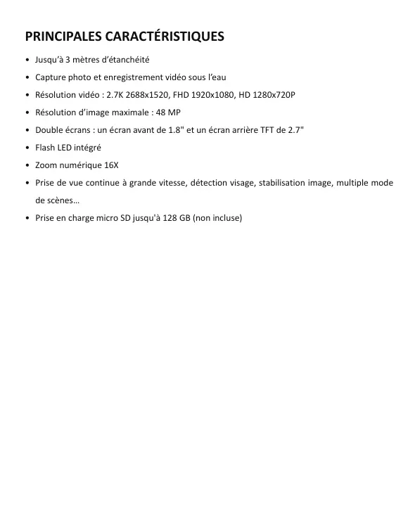 - Résolution vidéo: 2.7K 2688x1520, FHD 1920x1080, HD 1280x720