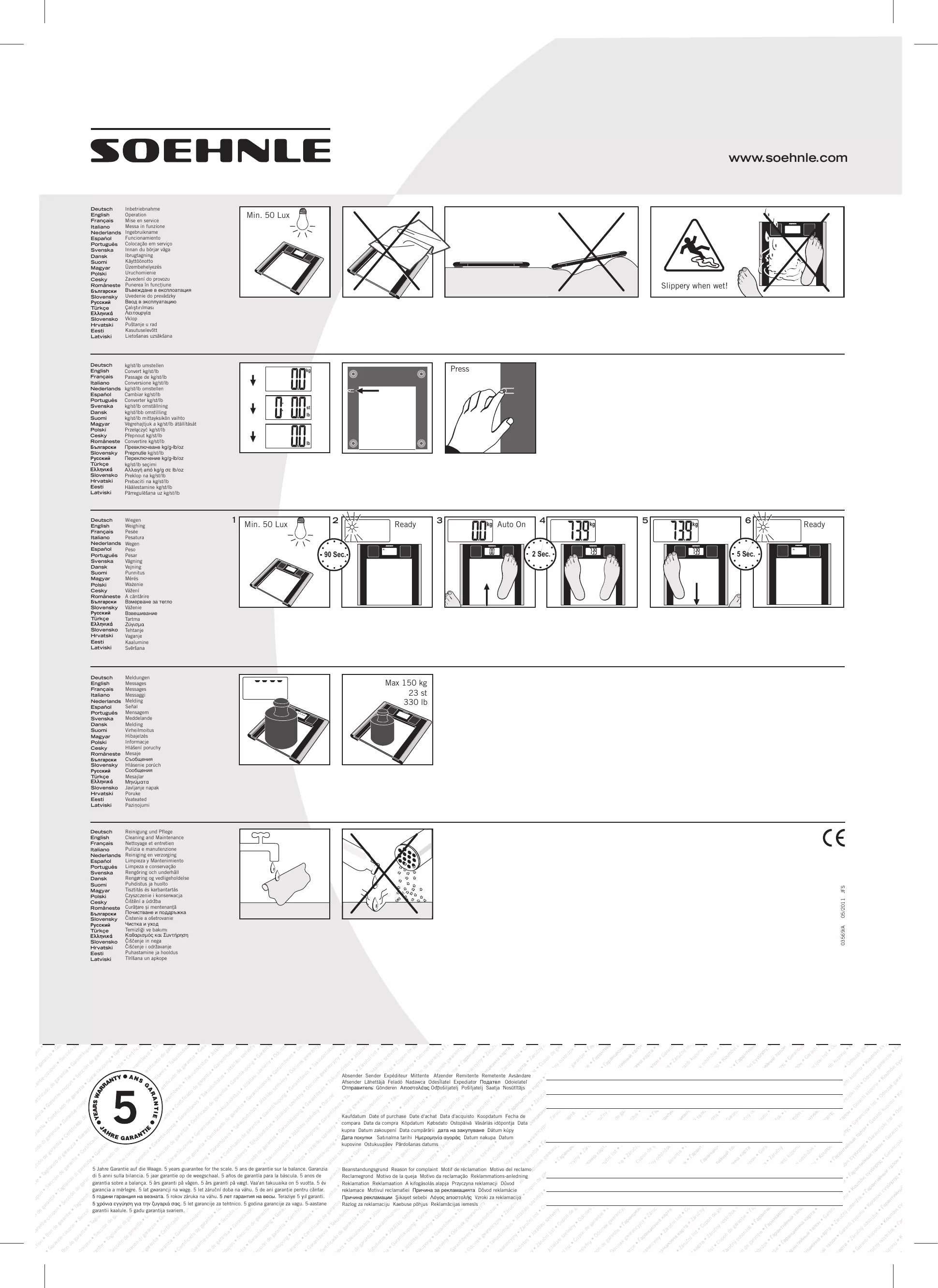Soehnle garantit, pour une durée de 5 ans à compter de la date d'achat, la suppression gratuite des défauts provenant de vices de matériel ou de fabrication par une réparation ou un échange. En cas de réclamation sous garantie, returnez l'appareil à votre revendeur avec le coupon de garantie et la facture.