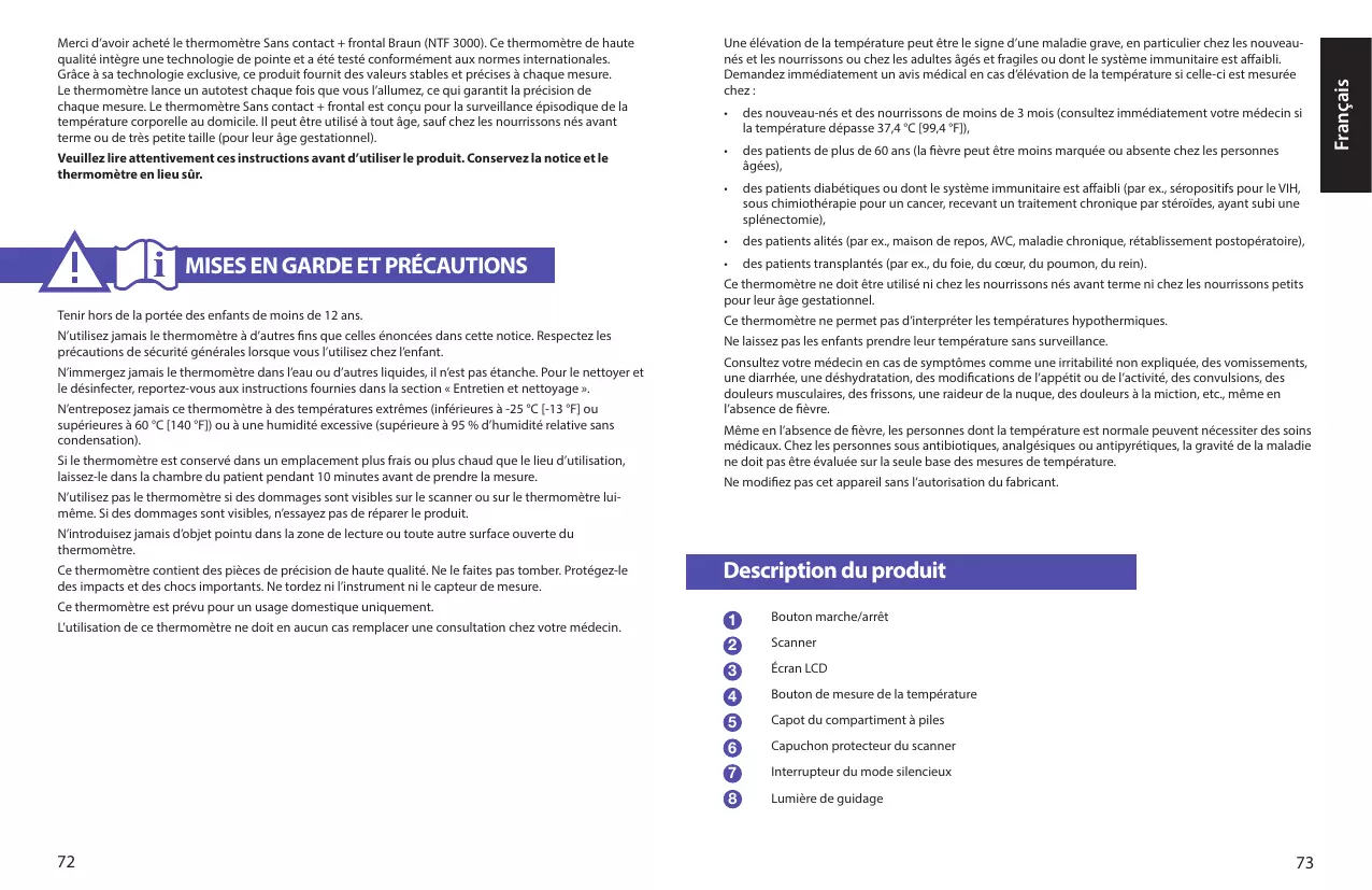 Français Merci d’avoir acheté le thermomètre Sans contact + frontal Braun (NTF 3000). Ce thermomètre de haute qualité intègre une technologie de pointe et a été testé conformément aux normes internationales. Grâce à sa technologie exclusive, ce produit fournit des valeurs stables et précises à chaque mesure. Le thermomètre lance un autotest chaque fois que vous l’allumez, ce qui garantit la précision de chaque mesure. Le thermomètre Sans contact + frontal est conçu pour la surveillance épisodique de la température corporelle au domicile. Il peut être utilisé à tout âge, sauf chez les nourrissons nés avant terme ou de très petite taille (pour leur âge gestationnel). Des mesures en moins de 2 secondes La technologie infrarouge innovante permet de mesurer la température frontale en moins de 2 secondes, que vous utilisiez l’option avec contact ou sans contact.
