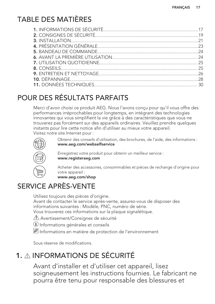 Obtenir des conseils d'utilisation, des brochures, de l'aide, des informations : www.aeg.com/webselfservice Enregistrez votre produit pour obtenir un meilleur service : www.registeraeg.com Acheter des accessoires, consommables et pièces de rechange d'origine pour votre appareil : www.aeg.com/shop