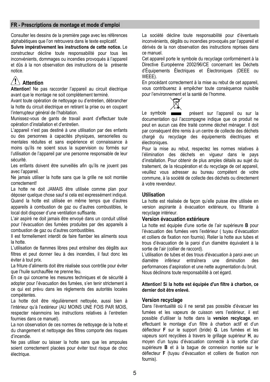 FR Prescriptions de montage et mode d’emploi EN Instruction on mounting and use FR - Prescriptions de montage et mode d’emploi La société décline toute responsabilité pour d’éventuels inconvénients, dégâts ou incendies provoqués par l’appareil et dérivés de la non observation des instructions reprises dans ce manuel. Cet appareil porte le symbole du recyclage conformément à la Directive Européenne 2002/96/CE concernant les Déchets d’Équipements Électriques et Électroniques (DEEE ou WEEE). En procédant correctement à la mise au rebut de cet appareil, vous contribuerez à empêcher toute conséquence nuisible pour l’environnement et la santé de l’homme. Consulter les dessins de la première page avec les références alphabétiques que l’on retrouvera dans le texte explicatif. Suivre impérativement les instructions de cette notice. Le constructeur décline toute responsabilité pour tous les inconvénients, dommages ou incendies provoqués à l’appareil et dûs à la non observation des instructions de la présente notice. Attention Attention! Ne pas raccorder l’appareil au circuit électrique avant que le montage ne soit complètement terminé. Avant toute opération de nettoyage ou d’entretien, débrancher la hotte du circuit électrique en retirant la prise ou en coupant l’interrupteur général de l’habitation. Munissez-vous de gants de travail avant d’effectuer toute opération d’installation et d’entretien. L’appareil n’est pas destiné à une utilisation par des enfants ou des personnes à capacités physiques, sensorielles ou mentales réduites et sans expérience et connaissance à moins qu’ils ne soient sous la supervision ou formés sur l’utilisation de l’appareil par une personne responsable de leur sécurité. Les enfants doivent être surveillés afin qu’ils ne jouent pas avec l’appareil. Ne jamais utiliser la hotte sans que la grille ne soit montée correctement! La hotte ne doit JAMAIS être utilisée comme plan pour déposer quelque chose sauf si cela est expressément indiqué. Quand la hotte est utilisée en même temps que d’autres appareils à combustion de gaz ou d’autres combustibles, le local doit disposer d’une ventilation suffisante. L’air aspiré ne doit jamais être envoyé dans un conduit utilisé pour l’évacuation des fumées produites par des appareils à combustion de gaz ou d’autres combustibles. Il est formellement interdit de faire flamber les aliments sous la hotte. L’utilisation de flammes libres peut entraîner des dégâts aux filtres et peut donner lieu à des incendies, il faut donc les éviter à tout prix. La friture d’aliments doit être réalisée sous contrôle pour éviter que l’huile surchauffée ne prenne feu. En ce qui concerne les mesures techniques et de sécurité à adopter pour l’évacuation des fumées, s’en tenir strictement à ce qui est prévu dans les règlements des autorités locales compétentes. La hotte doit être régulièrement nettoyée, aussi bien à l’intérieur qu’à l’extérieur (AU MOINS UNE FOIS PAR MOIS, respecter néanmoins les instructions relatives à l’entretien fournies dans ce manuel). La non observation de ces normes de nettoyage de la hotte et du changement et nettoyage des filtres comporte des risques d’incendie. Ne pas utiliser ou laisser la hotte sans que les ampoules soient correctement placées pour éviter tout risque de choc électrique. Le symbole présent sur l’appareil ou sur la documentation qui l’accompagne indique que ce produit ne peut en aucun cas être traité comme déchet ménager. Il doit par conséquent être remis à un centre de collecte des déchets chargé du recyclage des équipements électriques et électroniques. Pour la mise au rebut, respectez les normes relatives à l’élimination des déchets en vigueur dans le pays d’installation. Pour obtenir de plus amples détails au sujet du traitement, de la récupération et du recyclage de cet appareil, veuillez vous adresser au bureau compétent de votre commune, à la société de collecte des déchets ou directement à votre revendeur. Utilisation La hotte est réalisée de façon qu’elle puisse être utilisée en version aspirante à évacuation extérieure, ou filtrante à recyclage intérieur. Version évacuation extérieure La hotte est équipée d’une sortie de l’air supérieure B pour l’évacuation des fumées vers l’extérieur ( tuyau d’évacuation et colliers de fixation non fournis). Relier la hotte aux tubes et trous d’évacuation de la paroi d’un diamètre équivalent à la sortie de l’air (collier de raccord). L’utilisation de tubes et des trous d'évacuation à paroi avec un diamètre inférieur entraînera une diminution des performances d’aspiration et une nette augmentation du bruit. Nous déclinons toute responsabilité à cet égard. Attention! Si la hotte est équipée d'un filtre à charbon, ce dernier doit être enlevé. Version recyclage Dans l’éventualité où il ne serait pas possible d’évacuer les fumées et les vapeurs de cuisson vers l’extérieur, il est possible d’utiliser la hotte dans la version recylcage, en effectuant le montage d’un filtre à charbon actif et d’un déflecteur F sur le support (bride) G. Les fumées et les vapeurs sont recyclées à travers le grillage supérieur H, au moyen d’un tuyau d’évacuation connecté à la sortie d’air supérieure B et à la bague de connexion montée sur le déflecteur F (tuyau d’évacuation et colliers de fixation non fournis).