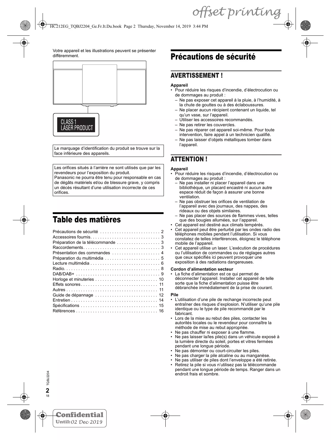 Appareil • Pour réduire les risques d’incendie, d’électrocution ou de dommages au produit : – Ne pas installer ni placer l’appareil dans une bibliothèque, un placard encastré ni aucun autre espace réduit de façon à assurer une bonne ventilation. – Ne pas obstruer les orifices de ventilation de l’appareil avec des journaux, des nappes, des rideaux ou des objets similaires. – Ne pas placer des sources de flammes vives, telles que des bougies allumées, sur l’appareil. • Cet appareil est destiné aux climats tempérés. • Cet appareil peut être perturbé par les ondes radio des téléphones mobiles pendant l’utilisation. Si vous constatez de telles interférences, éloignez le téléphone mobile de l’appareil. • Cet appareil utilise un laser. L’exécution de procédures ou l’utilisation de commandes ou de réglages autres que ceux spécifiés ici peuvent provoquer une exposition à des radiations dangereuses. Cordon d’alimentation secteur • La fiche d’alimentation est ce qui permet de déconnecter l’appareil. Installer cet appareil de telle sorte que la fiche d’alimentation puisse être débranchée immédiatement de la prise de courant. Pile • L’utilisation d’une pile de rechange incorrecte peut entraîner des risques d’explosion. N’utiliser qu’une pile identique ou le type de pile recommandé par le fabricant. • Lors de la mise au rebut des piles, contacter les autorités locales ou le revendeur pour connaître la méthode de mise au rebut appropriée. • Ne pas chauffer ni exposer à une flamme. • Ne pas laisser la/les pile(s) dans un véhicule exposé à la lumière directe du soleil, portes et vitres fermées pendant une longue période. • Ne pas démonter ou court-circuiter les piles. • Ne pas charger la pile alcaline ou au manganèse. • Ne pas utiliser de piles dont l’enveloppe a été retirée. • Retirez la pile si vous n’utilisez pas la télécommande pendant une longue période de temps. Ranger dans un endroit frais et sombre.