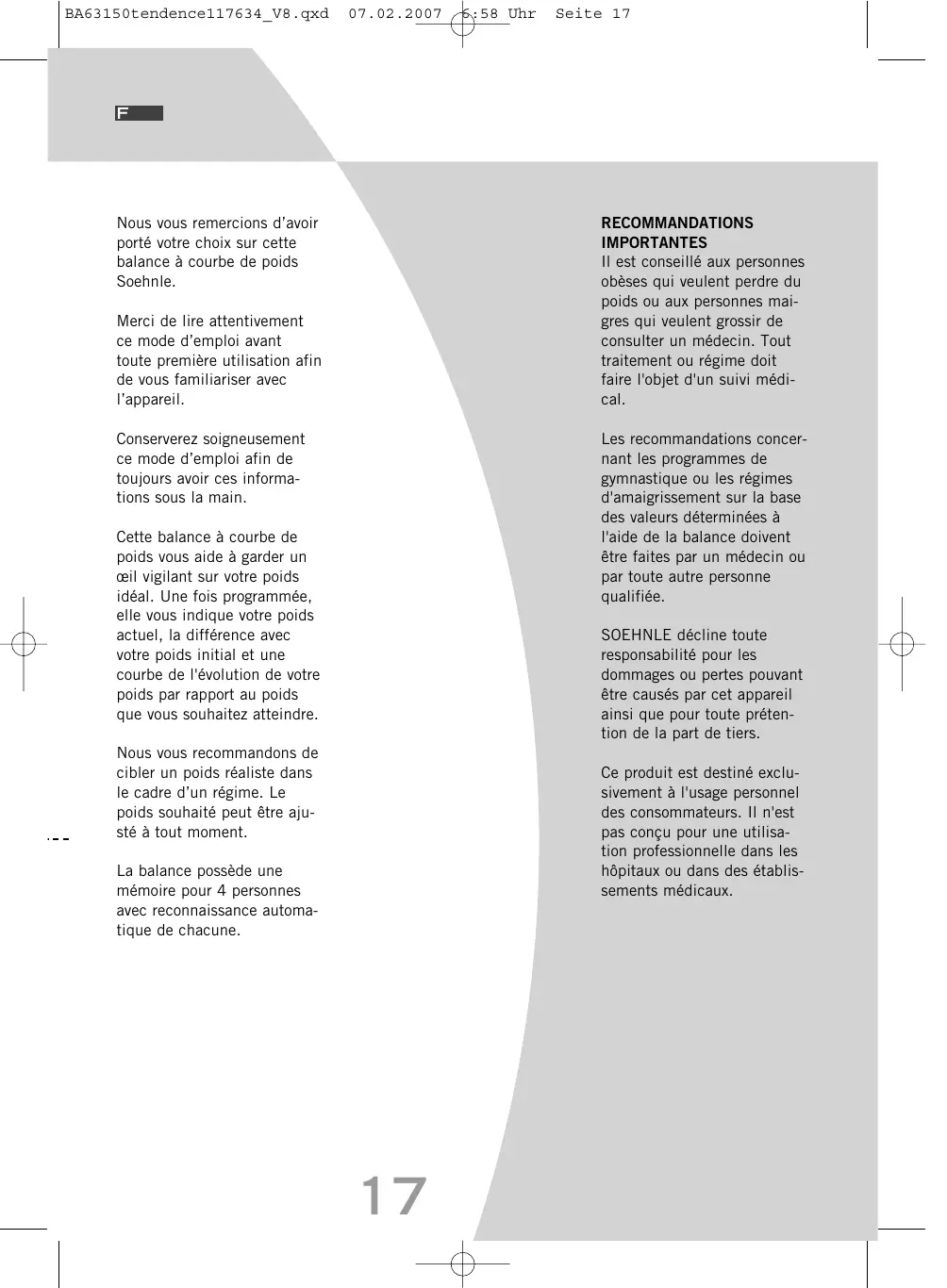 SOEHNLE décline toute responsabilité pour les dommages ou pertes pouvant être causés par cet appareil ainsi que pour toute prétention de la part de tiers.