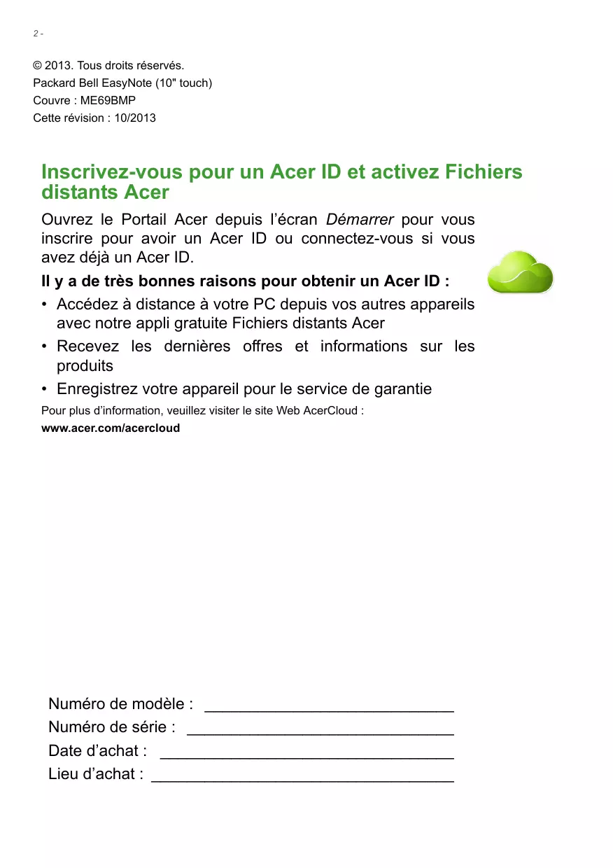 © 2013. Tous droits réservés. Packard Bell EasyNote (10" touch) Couvre : ME69BMP Cette révision : 10/2013 Inscrivez-vous pour un Acer ID et activez Fichiers distants Acer Ouvrez le Portail Acer depuis l’écran Démarrer pour vous inscrire pour avoir un Acer ID ou connectez-vous si vous avez déjà un Acer ID. Il y a de très bonnes raisons pour obtenir un Acer ID :