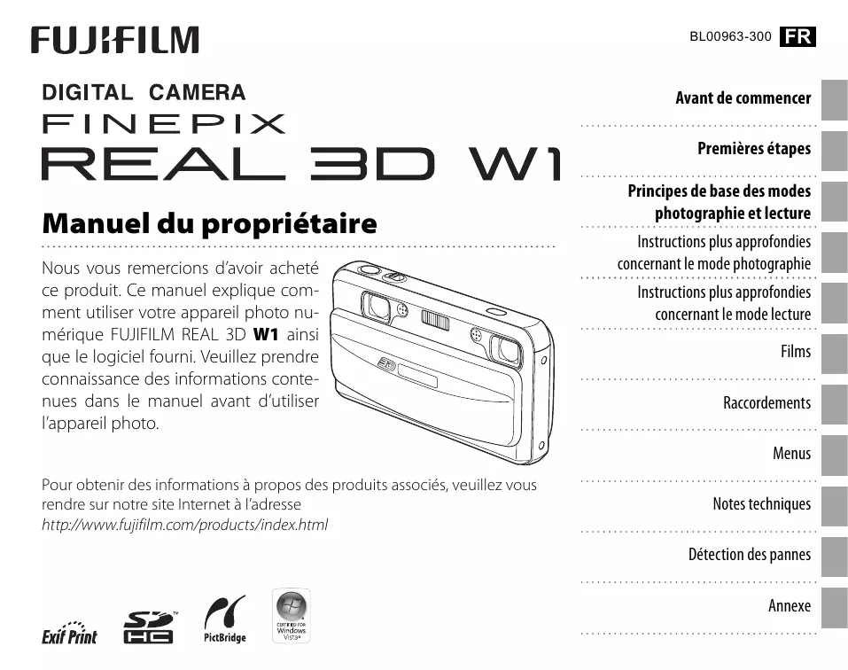 Nous vous remercions d'avoir acheté ce produit. Ce manuel explique comment utiliser votre appareil photo numérique FUJIFILM REAL 3D W1 ainsi que le logiciel fourni. Veuillez prendre connaissance des informations contenues dans le manuel avant d'utiliser l'appareil photo.