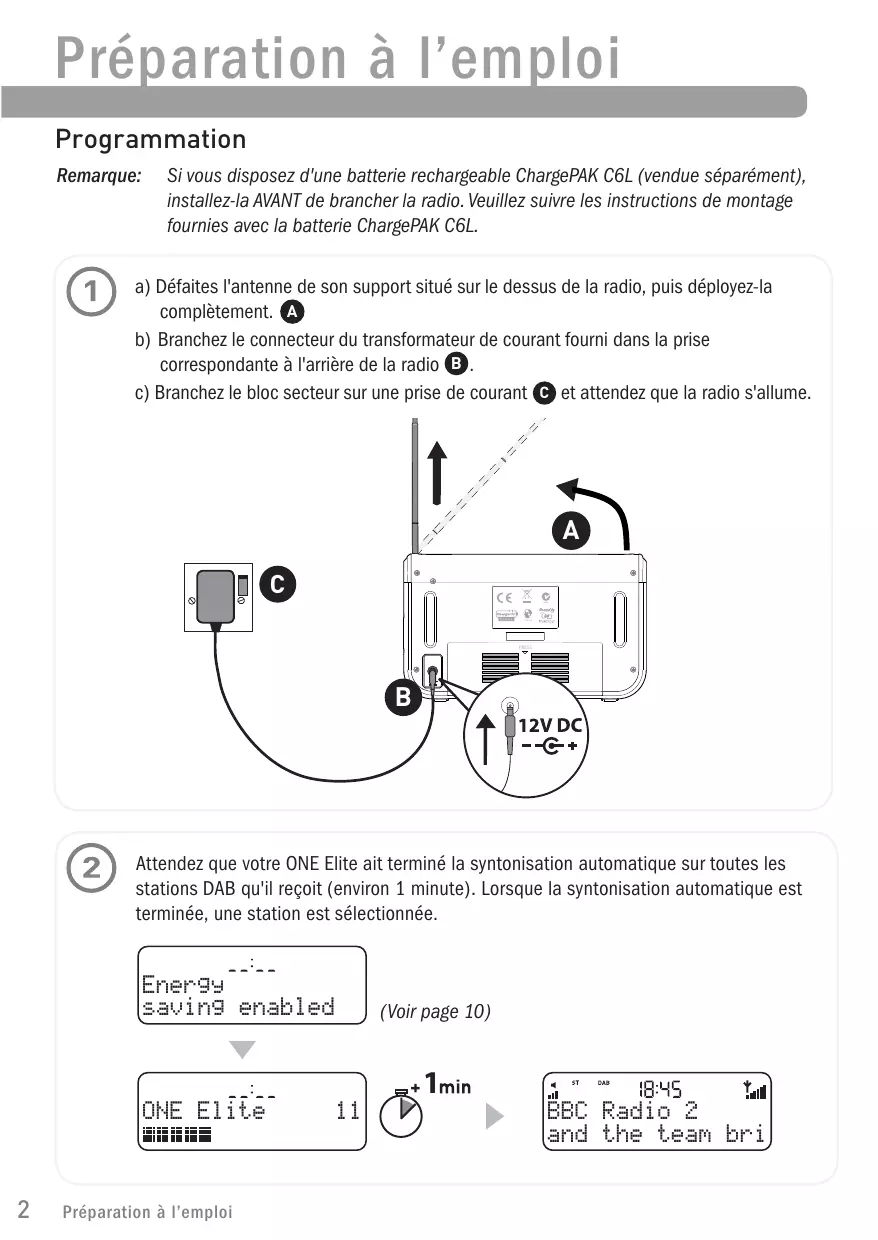 a) Défaites l'antenne de son support situé sur le dessus de la radio, puis déployez-la complètement. b) Branchez le connecteur du transformateur de courant fourni dans la prise correspondante à l'arrière de la radio B. c) Branchez le bloc secteur sur une prise de courant et attendez que la radio s'allume.