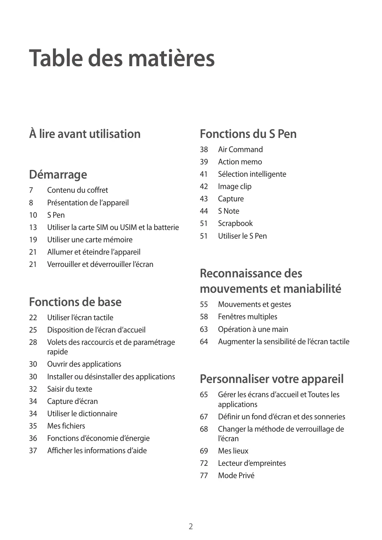 Contenu du coffret Présentation de l’appareil S Pen Utiliser la carte SIM ou USIM et la batterie Utiliser une carte mémoire Allumer et éteindre l’appareil Verrouiller et déverrouiller l’écran Reconnaissance des mouvements et maniabilité Fonctions de base